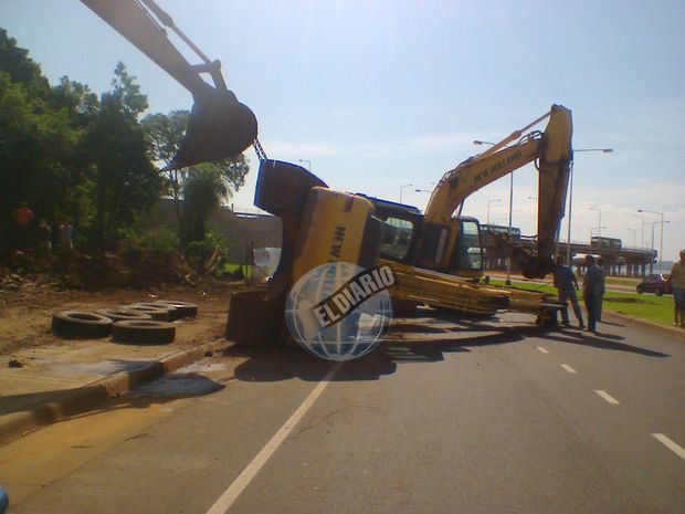 Una máquina retroexcavadora que era transportada a bordo de un camión se desprendió de dicho vehículo, por causas que se investigan, y cayó sobre el asfalto en plena avenida costanera de Posadas, en un insólito accidente que afortunadamente no se cobró heridos.Sin embargo, sí se registraron daños materiales y, sobre todo, graves problemas en el tránsito, que tuvo que permanecer cortado durante largo tiempo entretanto se logró rescatar la grúa y apartarla del camino.Ocurrió este miércoles por la mañana sobre el mencionado paseo costero, entre las avenidas Cabred y Maipú, en cercanías de la zona donde se realizan excavaciones para la construcción de un lujoso edificio del Instituto Provincial de Lotería y Casinos (Iplyc).Fotos: M. Fedorischak