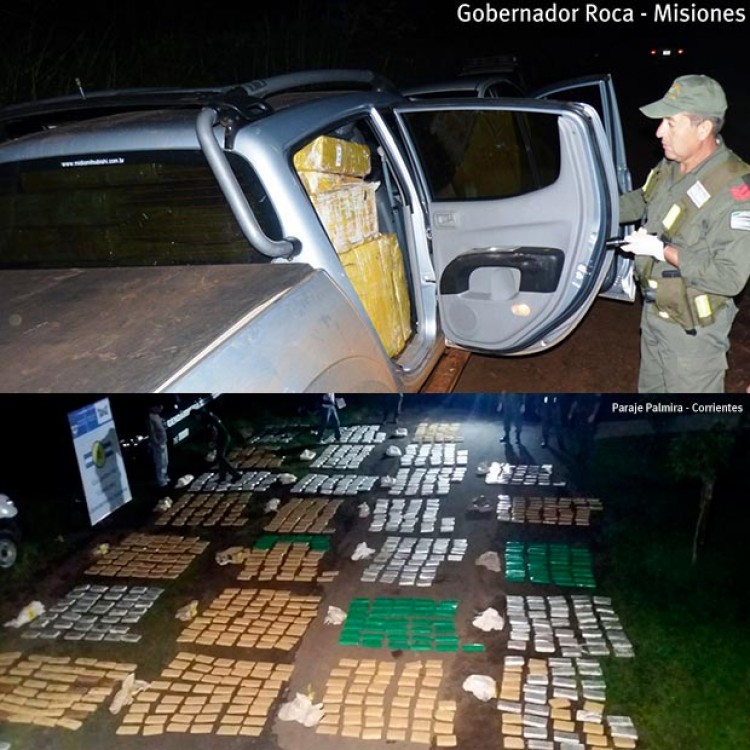 Así como el narcotráfico no cesa en sus intentos por movilizar drogas por las rutas argentinas, tampoco cesa el trabajo de las fuerzas en tratar de detenerlos. Así, personal de Gendarmería Nacional de Corrientes y Misiones realizaron dos operativos el viernes en horas de la noche.En el primero de ellos, efectivos del Escuadrón 48 "Corrientes" de Gendarmería Nacional realizaban un operativo cerrojo, en una zona cercana al Paraje La Palmira, donde detectaron la presencia de individuos en actitud sospechosa.Al intentar de identificar a los hombres, estos se dieron a la fuga en la espesura del monte circundante, pero los efectivos continuaron inspeccionando la zona y hallaron treinta bultos de diferentes tamaños que contenían aproximadamente 900 kilos de marihuana. En el hecho interviene el Juzgado Federal de Corrientes.En el segundo procedimiento, realizado en Gobernador Roca, GN incautó 1.078, 233 kilogramos de marihuana distribuidos en 1.237 paquetes, que eran transportados en un rodado.Efectivos de la Sección Núcleo dependientes del Escuadrón 11 “San Ignacio” realizaban patrullajes motorizados y a pie en inmediaciones a la ruta nacional 12, a 400 metros del ingreso al "Puerto Sánchez, cuando divisaron una camioneta Mitsubishi que se acercaba al lugar.Los uniformados efectuaron la señalización con linternas, a los fines de que el rodado detuviera su marcha para poder realizar la identificación correspondiente. En ese momento, el conductor, abandonó el vehículo y huyó hacia el monte.Inmediatamente, los gendarmes llevaron a cabo una inspección sobre el rodado, constatando que en su interior se ocultaban 51 bultos que contenían paquetes rectangulares. Los cuales al ser sometidos a las pruebas de Campo Narcotest arrojaron resultado positivo para "cannabis sativa".Intervino la Fiscalía Federal de Oberá que orientó el secuestro de la droga como así también de la camioneta.