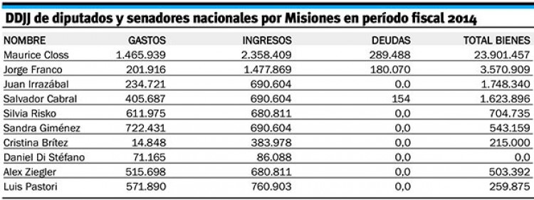 Al finalizar su séptimo año de mandato como gobernador de Misiones, Maurice Closs presentó en su declaración jurada del año 2014 una formidable fortuna de 24 millones de pesos en bienes como empresas, propiedades, vehículos, etc. Es la última declaración a la que se puede acceder del funcionario misionero pero no se encuentra actualizada ya que no se incluyen los bienes que pudo haber adquirido en 2015/2016 y que hicieron crecer su patrimonio.El exgobernador es el político más acaudalado de Misiones, de acuerdo a todas las declaraciones juradas que deben presentar los funcionarios ante la Oficina Anticorrupción de la Nación.Durante todo el tiempo que fue gobernador, Closs mantuvo en secreto su declaración jurada, porque solamente se la presentaba al Fiscal de Estado de Misiones, Fidel Duarte y este funcionario clossista la guardaba bajo siete llaves, negando el acceso a cualquier periodista, ciudadano o institución que requiriera conocer cómo se enriqueció el exgobernador en su paso por la función pública.A nivel nacional la normativa es diferente ya que es obligación de todos los funcionarios nacionales presentar sus DDJJ y exhibirlas en público. Mientras era gobernador no se conocía su enriquecimiento, sin embargo ahora que es diputado nacional no tiene otra opción.El nuevo cargo le exige cumplir con la ley de Ética Pública que rige a nivel nacional. En ese marco, declaró un total de bienes por $23.901.457,56; ingresos por $2.358.409,45 y alquileres por $1.246.887,89. El cargo le demanda hacer públicas sus DDJJ.La información está disponible en el sitio web www.datos.gob.ar, del Ministerio de Modernización de la Presidencia de la Nación, donde hay más de 150 mil funcionarios nacionales que han presentado sus declaraciones juradas del año 2014. De todas las declaraciones de misioneros disponibles, el segundo que más patrimonio declaró fue Oscar Thomas, exdirector de la EBY, pero que actualmente no es funcionario, con un total de bienes de 10 millones de pesos. La expresidenta de la Casa de la Moneda, vinculada a Amado Boudou, la misionera Katya Daura, admitió tener 1,2 millones de pesos en bienes en su DDJJ de 2014. En el cuadro que ilustra la presente investigación se encuentran los otros nueve legisladores nacionales, además de Closs (seis diputados y tres senadores) que representan a Misiones en el Congreso y elevaron su DDJJ al período 2014.Llama la atención algunos casos como el de Daniel Di Stéfano, que no declaró poseer bienesLuego del exgobernador, entre los legisladores con más bienes le sigue su pariente, el exministro de Gobierno Jorge Franco, que poseía en aquel entonces 3,5 millones de pesos, seguido por el senador Juanchi Irrazábal, (1,7 millón); el senador Salvador Cabral (1,6 millón) y Silvia Risko con 700 mil pesos.Según explicó un contador a PRIMERA EDICIÓN, normalmente, las declaraciones juradas de funcionarios toman a sus bienes (propiedades, vehículos, etc) con valores inferiores a los que cotizarían en el mercado. Por lo tanto, si todos los bienes se pusieran en venta, seguramente obtendrían un valor muy superior a lo declarado.