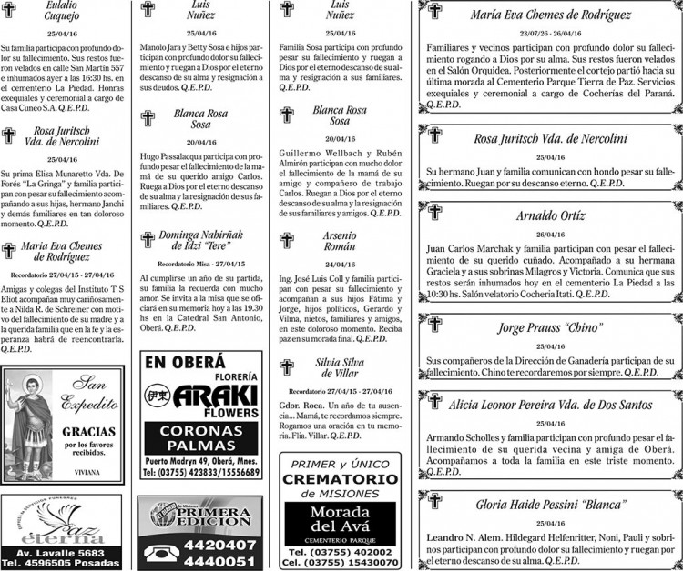 Fúnebres del miércoles 27 de abril de 2016