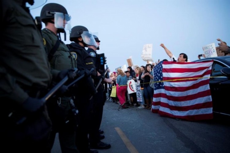 "Se llevaron a cabo cinco arrestos por poner resistencia a las fuerzas del orden", dijo a la AFP un portavoz de la policía de la localidad de Burlingame, donde tuvieron lugar los incidentes. Para evitar a la multitud furiosa, el empresario decidió entrar y salir por la puerta trasera del hotel en el que dio un discurso."No ha sido la entrada más fácil (…). Ha sido como cruzar la frontera" entre Estados Unidos y México, dijo al comenzar su discurso, una provocación dirigida a los latinos que ondeaban banderas mexicanas fuera."Estoy aquí porque no me gusta lo que Trump ha estado diciendo últimamente sobre los inmigrantes y los latinos", contó a la AFP Eric López. "No todos somos como se piensa que somos", agregó. Los manifestantes se enfrentaron con agresividad a la policía para poder acceder al edificio, comprobó un fotógrafo de la AFP. Un grupo llegó a subirse a varias estructuras del hotel e intentó romper algún cristal para meterse dentro. Policías protegidos con cascos presionaron para impedir el avance de los manifestantes, pero éstos aumentaron los forcejeos y les lanzaron huevos. Los manifestantes también atacaron a los periodistas, a quienes les reclamaron no tomar fotografías. La muchedumbre gritó "Fuck Donald Trump" (Que te jodan Donald Trump), mientras portaba pancartas con la leyenda "El miedo y el odio no son presidenciales".Un seguidor de Trump que se confrontó a la multitud estuvo a punto de ser linchado, pero las fuerzas de seguridad lo rescataron a tiempo.Trump, que lidera la carrera por la nominación presidencial del Partido Republicano para los comicios de noviembre, está centrando ahora parte de su campaña en California (oeste) de cara a las primarias de junio.La elección interna en el estado con mayor población latina del país se presenta como un reto para el magnate, dada la beligerante retórica que usa contra la comunidad hispana. El empresario insiste en expulsar a los 11 millones de inmigrantes indocumentados y en obligar a México a construir un muro que separe ambos países, lo que ha provocado la ira de miles de ciudadanos. "La comunidad está harta de ser denigrada, deshonrada, y atacada", dijo a la AFP el portavoz de la Coalición por los Derechos Humanos de los Inmigrantes en Los Ángeles (CHIRLA, en inglés)."Sin embargo, nuestra reacción debe ser marchar pacíficamente, como siempre lo hemos hecho, y votar en las urnas", señaló. La presencia del empresario en California provocó la noche del jueves otra violenta protesta en Costa Mesa, una pequeña localidad situada al sur de Los Ángeles, durante la que al menos 17 personas fueron detenidas, según el diario Los Angeles Times.Fuente: Agencia de Noticias AFP/NA