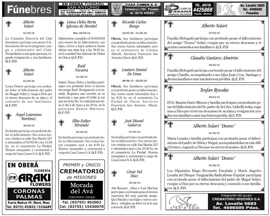 Fúnebres del martes 3 de mayo de 2016