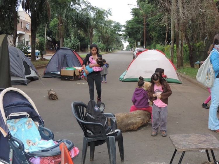 Las veinte familias desalojadas el 27 de abril de un lote del corazón de la chacra 189 (entre avenidas Centenario, 115, Alem y Monseñor D’Andrea) ayer se movilizaron reclamando la presencia del Gobierno y del juez César Yaya para lograr una solución habitacional. Reclaman que alguien responda por el modo en que fueron desalojados.Pasaron las noches más frías de lo que va del año en la calle. Hace diez días apenas descansan en las carpitas instaladas sobre la avenida 115 y Centenario de esta ciudad.“A un vecino discapacitado de 90 años lo sacaron de la casa y tiraron su silla de ruedas al barro. Él quiso quedar en el acampe, ayer (por el miércoles) tuvimos que internarlo y falleció. Ahora no podemos ni siquiera conseguir cómo llevarlo a enterrar a Concepción de la Sierra donde también está su esposa”, explicó a PRIMERA EDICIÓN Joaquín Pedrozo, un vecino. “De parte del Gobierno nadie apareció, nos desalojaron como perros de nuestras casas”, señaló Romina Maidana, que vive allí hace años. “Con el desalojo se perdieron cosas valiosas que cuesta conseguir, garrafas, ropa, algunos documentos, los cuadernos de la escuela”, resaltó.Sin respuestasDe las veinte familias desalojadas “no todas estaban viviendo en el lote que reclaman los dueños, entonces estamos construyendo las casas de nuevo en ese otro terreno”, dijo Maidana. Elvira Álvarez (32), manifestó: “Necesitamos un lugar digno donde vivir. Nosotros vamos a pagar con nuestro trabajo”.Consultado al respecto, el secretario de Regularización de Tierras y Agua de la Municipalidad de Posadas, Jorge Atencio, dijo a PRIMERA EDICIÓN que “en Posadas hay muchas familias en esta situación” y que “estamos trabajando con la gente que tiene muchos años en estas condiciones. Formamos la comisiones Pro tierra y trabajamos en forma organizada, explicando cuales son sus derechos”.Puntualmente en este caso, indicó que “ellos tendrían que ir al Iprodha a anotarse al registro de situaciones de emergencia. Y mientras tanto volver a su lugar de origen”.Infancias en riesgoEn total son cerca de 50 los bebés y niños que hace diez días duermen en las carpas en plena calle. Algunos están yendo a la escuela, otros deben faltar porque quedaron sin ropa o perdieron sus útiles. Las madres cocinan en una precaria mesita en la vereda del Caps. Lo que más necesitan para los chicos son zapatillas y abrigos.Una mañana trágica“Eran las 7 de la mañana. Mi nena se había ido a la escuela -Nº 645, que queda sobre 115 y Alem- y yo estaba en la cama con las gemelas -son sus hijas menores, tienen tres años y sufren problemas respiratorios- porque hacía mucho frío. Escucho el patrullero. La Policía comienza a golpear a la puerta”, así lo recordó Elvira Álvarez, una joven madre de seis hijos que hoy sueña con terminar la secundaria. Este año cursa su quinto año. “Fue muy difícil cursar, al principio iba con las gemelas en el coche. y no voy a dejar porque quiero recibirme para poder conseguir un mejor trabajo”, recalcó.Retomando el relato del desalojo, indicó “me avisan que tenía que salir de la casa. Yo no quería pero me dijeron que tenía que salir sí o sí. Entonces les dije que tenía que llevar a mis hijas a la casa de mi mamá, porque no pueden estar en el frío”, contó. “A los que no salían les sacaban a tirones. Quedaron nuestras cosas en el piso”, dijo. Luego los operarios empujaron las casas que cayeron nomás, porque son de madera.