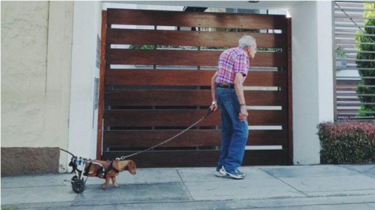 En la imagen de Facebook, se ve que un abuelo está caminando con un pequeño perro. Este animalito no tiene patas traseras y utiliza un soporte con ruedas para poder movilizarse. "Cosas que te alegran el día: ver un claro ejemplo de amor y compromiso entre dos seres, uno en silla de ruedas y el otro muy mayor" escribió la usuaria. "El abuelito caminaba lento y su perro se mantenía al margen justo para que avancen juntos a la vez, cada uno a su ritmo. De rato en rato el señor volteaba a ver que su perro esté caminando cómodo y a buen ritmo", agregó en la publicación de Facebook."Querer es poder, amigos, a pesar de nuestras limitaciones podemos hacer a muchos otros felices, tanto personas como animales", reflexionó la joven en el texto que acompaña la imagen. Fuente:Comercio