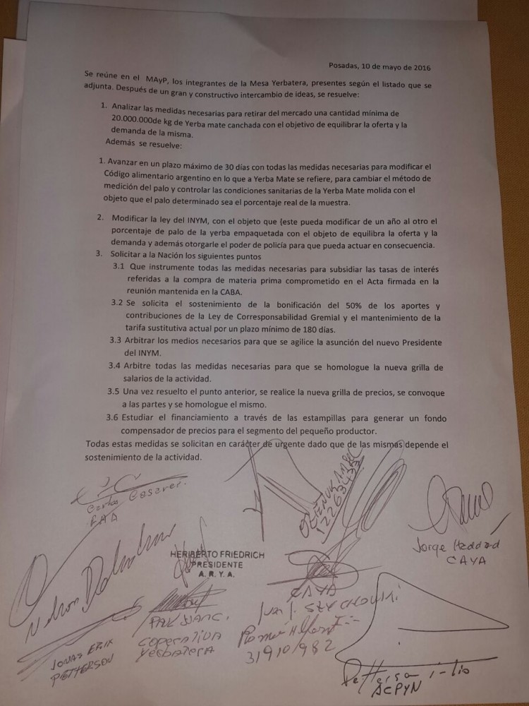 La Mesa Yerbatera se reunió con el ministro del Agro y la Producción, José Luis Garay, y elaboró un documento en el que se plasma el "compromiso" de analizar el retiro del mercado de unos 20 millones de kilos de yerba canchada para equilibrar la oferta y la demada, medida que buscará aleccionar a los grandes compradores que desde el inicio de la zafra especulan tirando abajo los precios por la sobreoferta de hoja verde.<p style="margin-bottom: 0cm;">También acordaron avanzar con la modificación del Código Alimentario Argentino para controlar la cantidad de palo presente en los paquetes de yerba mate, ante el exceso que denuncian los productores y que repercute en la menor cantidad de hoja verde requerida por la industria y en la calidad del producto final. </p><p style="margin-bottom: 0cm;">Paralelamente proponen modificar la Ley de Creación del Inym para que el organismo pueda definir año a año el porcentaje de palo para equilibrar la oferta y la demanda.</p><p style="margin-bottom: 0cm;">El documento, que lleva la firma de los representantes del Instituto Nacional de la Yerba Mate (Inym), de los referentes de los productores y de las asociaciones que nuclean a la industria, también reflejó el acuerdo para solicitarle al Gobierno nacional que efectivamente subsidie las tasas de interés para la compra de materia prima; que sostenga la bonificación del 50% de los aportes y contribuciones de la Ley de Corresponsabilidad Gremial y el mantenimiento de la tarifa sustitutiva actual por un plazo de 180 días. </p><p style="margin-bottom: 0cm;">Finalmente le pedirán que agilice la asunción del nuevo presidente del Inym, que se homologuen con urgencia los nuevos valores de los salarios de tareferos, cuadrilleros y peones, y que una vez definidos estos puntos, se convoque a una nueva concertación de precios.</p><p style="margin-bottom: 0cm;">Los productores se mantienen en alerta y este sábado realizarán una nueva asamblea abierta en el Cruce Karaben para definir si retoman la protesta y vuelven a paralizar la cosecha, en reclamo de que se establezca un nuevo precio de la hoja verde y la yerba canchada que refleje los costos de producción, y que se apliquen medidas urgentes para asegurar el pago al contado de la materia prima.  </p>
