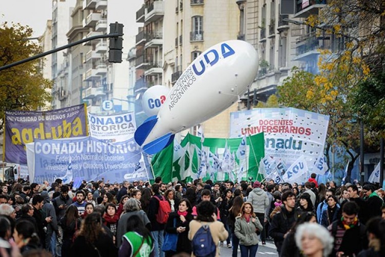 La movilización, que integraron representantes de los sindicatos Conadu, Conadu Histórica, Fedun, Fagdut, UDA y Ctera y federaciones estudiantiles como FUA, FUBA y FULP, partió de la Plaza Houssay, llegó al Palacio Pizzurno y culminó en la princiapl plaza porteña frente a la Casa Rosada."Queremos que haya presupuesto para las universidades, nuestro país necesita científicos, biólogos, médicos y eso se nutre de las universidades", sostuvo Eduardo Lopez, secretario gremial de Ctera, luego de que se leyera un documento con reclamos al Gobierno frente al edificio de Educación.En el edificio del Ministerio, decanos y vicedecanos de Filosofía y Letras, Sociales, Exactas, Psicología, Agronomía y Arquitectura de la Universidad de Buenos Aires (UBA) entregaron un petitorio con más de 42 mil firmas en defensa de la universidad."El escenario se ve agravado por la falta de incorporación de las partidas adicionales previstas en el Presupuesto 2016, la suspensión de numerosas obras de infraestructura acordadas con la Secretaría de Obras Públicas, la actualización tarifaria sobre los servicios públicos y la quita de subsidios sobre los mismos", se planteó en el escrito.El grueso de los manifestantes lo aportaron numerosas organizaciones estudiantiles, que portaban banderas y pancartas de sus agrupaciones o bien con mensajes contra "el ajuste" del Gobierno. También participaron militantes de partidos de izquierda, como el Partido Obrero, la Izquierda Socialista y el MST, y varios de sus dirigentes, como la diputada Myriam Bregman, quien sostuvo que "va casi un mes de este conflicto y, a pesar de las marchas, paros, clases públicas, asambleas y tomas en los lugares de estudio, el reclamo nacional contra el ajuste educativo sigue sin respuestas".La concentración se realizó en la Plaza Houssay, en el barrio de Recoleta, pasadas las 17 los manifestantes llegaron al Ministerio que conduce Esteban Bullrich, donde se realizó un acto, y cerca de las 20 las columnas ingresaron a la Plaza de Mayo, donde concluyó la jornada de protesta. Al no tener respuestas del Gobierno, los sindicatos de docentes universitarios profundizaron su reclamo para que se asegure "el funcionamiento de todas las universidades del país y que reabran las paritarias", luego de rechazar el ofrecimiento de un aumento salarial del 20% en dos coutas, lejos de las aspiraciones de los gremios que se acercan al 40%.Si bien, el presidente Mauricio Macri anunció la última semana aportes por 500 millones de pesos para "cubrir el incremento de tarifas y gastos de funcionamiento adicional en las universidades públicas del país", Eduardo López recordó que la UBA (Universidad de Buenos Aires" ya avisó que no alcanza".Desde hace semanas, los docentes universitarios se encuentran en un plan de lucha nacional con paros y clases públicas en las calles, estaciones de trenes y subtes para visibilizar su reclamo salarial y de mayor presupuesto.Por su parte, el ministro Bullrich afirmó que los planteos de quienes convocaron a la marcha "están basados en datos falsos" y señaló que "se quiere crear una crisis donde no la hay". "En cuatro meses el Gobierno no solamente ha cubierto las deudas que nos dejaron sino puesto al día la inversión a las universidades", dijo, al tiempo que consideró: "Hay una toma de medidas extremas que no se condicen con la realidad de lo que está pasando, no estamos desfinanciando el sistema"."Creo que no tenemos responsabilidad en el conflicto, llegamos a conducir la secretaría universitaria con tres meses de deuda, se debían dos cuotas de becas universitarias. Hoy nos pusimos al día con las becas, con las deudas pasadas, con el gasto de funcionamiento, depositamos mes de abril, nosotros estamos cubriendo deuda de más de 3 mil millones de pesos que había cuando llegamos", argumentó en declaraciones radiales.Fuente: Agencia de Noticias NA