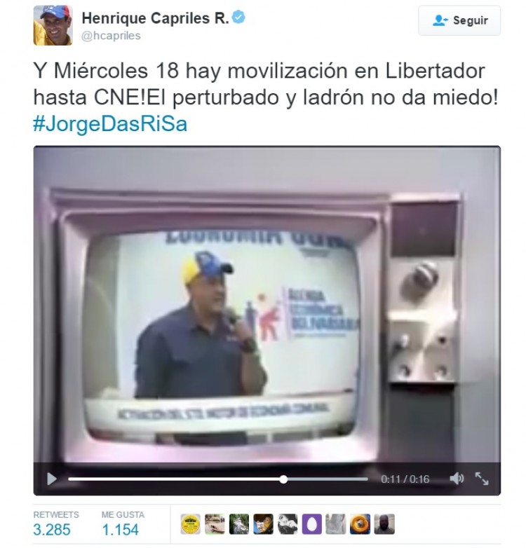 El líder opositor Henrique Capriles ratificó este domingo la convocatoria a una movilización nacional callejera para el miércoles próximo para reclamar mayor celeridad en el trámite del referendo revocatorio del mandato del presidente de Venezuela, Nicolás Maduro, pese a que <a href="http://www.primeraedicion.com.ar/nota/220747/maduro-decreta-estado-de-excepcion.html">el gobierno afirmó que la consulta no se realizará</a>.La Mesa de la Unidad Democrática (MUD) opositora saldrá a las calles el miércoles "exigiendo respeto a la Constitución y cumplimiento reglamento revocatorio", dijo Capriles en un mensaje en la red social <a href="https://twitter.com/hcapriles/status/731930088732819456?lang=es">Twitter</a>.Simpatizantes de la MUD ya marcharon por el mismo motivo el miércoles pasado y este sábado, y en ambos casos el gobierno desplegó una gran cantidad de militares y policías para impedirles que llegaran hasta la sede del Consejo Nacional Electoral (CNE).La MUD inició meses atrás ante el CNE los trámites para la realización del referendo revocatorio y acusa al organismo, que está bajo control del chavismo, de demorarlo para evitar que se efectúe antes del 10 de enero de 2017.La Constitución dispone que si Maduro fuera revocado antes de esa fecha -cuando se cumplen cuatro años de su mandato- debe llamarse inmediatamente a elecciones, pero si ello ocurre después el período debe ser completado por el vicepresidente, que no es electo sino designado por el mandatario.El vicepresidente del gobierno, Aristóbulo Istúriz, y el vicepresidente del Partido Socialista Unido de Venezuela (PSUV) gobernante, capitán Diosdado Cabello, afirmaron este domingo que el referendo no se realizará, debido a irregularidades en su tramitación.Fuente: Télam