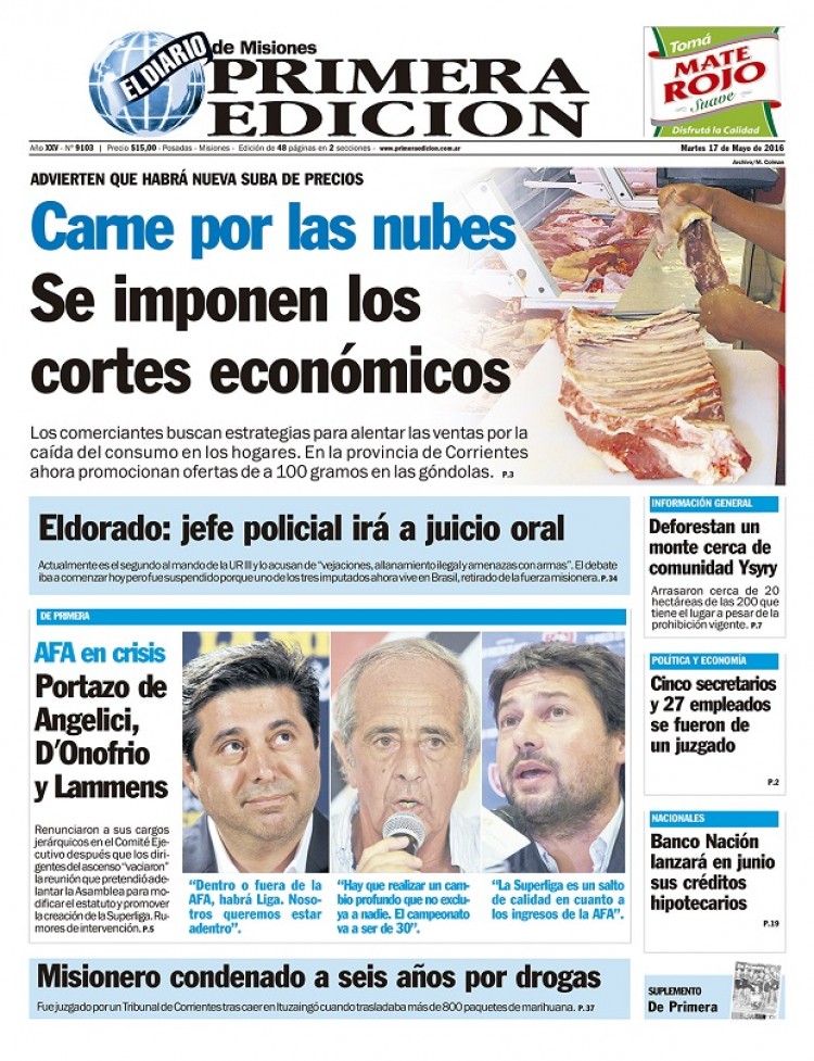 POLÍTICA Y ECONOMÍA-Cinco secretarios y 27 empleados abandonaron el Juzgado de Éctor Acosta en apenas tres años.-Aumentan las ventas de los cortes más económicos de carne vacuna en Posadas.-La Mesa Yerbatera acordó seis puntos de trabajo para paliar la crisis del sector.INFORMACIÓN GENERAL-La comunidad Ysyry de Colonia Delicia denunció destrucción de monte protegido.-Comercios de Apóstoles deberán tener seguro de responsabilidad. -El festejo de los 70 años del Aeroclub Oberá fue todo un éxito a pesar de la lluvia.SOCIEDAD-Inauguraron el nuevo edificio de consultorios externos en el Hospital Materno Neonatal de Posadas.-Se inició la celebración de la Semana del Parto Respetado.-El Cedit no consigue fondos para pagar las deudas con los becarios.NACIONALES E INTERNACIONALES-Se inició la devolución del 15% de la coparticipación a las provincias.-Lázaro Báez pidió que lo liberen y que le devuelvan sus bienes. -Expresidente de Colombia echa más nafta al fuego en Venezuela.CULTURA-Todo listo para la realización del séptimo "Iguazú en Concierto".-Todo sobre la entrega de los Martín Fierro del domingo.-Exposición de “Arte y trabajo en la Argentina”.POLICIALES-Segundo jefe policial de Eldorado va a juicio por vejaciones y amenazas.-Otra mujer perdió la vida tras despistar un automóvil sobre la ruta 12.-Misionero condenado a seis años de cárcel por narcotráfico.DEPORTES-Los presidentes de Boca, River y San Lorenzo dieron el "portazo" en la AFA.-Toda la actualidad del Nacional de Clubes Femenino de futsal en Posadas.-Mitre todavía podría llegar al torneo Federal B.-Patín: Calor misionero en la fría San Luis.