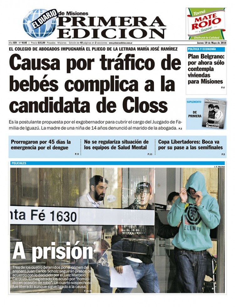POLÍTICA Y ECONOMÍA-Una causa por supuesto tráfico de bebés "roza" a la postulante de Closs a jueza de Familia de Iguazú.-Plan Belgrano: el Gasoducto es prioridad, pero “recién está en la primera etapa”. -Cooperativas se involucran en la energía a partir de biomasa.INFORMACIÓN GENERAL-No se tocará la polémica tasa por instalación de antenas en San Vicente.-Candelaria también debate el "Alcohol Cero" al volante.SOCIEDAD-Dengue: prorrogan emergencia epidemiológica por otros 45 días.-Aún no se regulariza la situación de los equipos de Salud Mental.NACIONALES-Todas las provincias recibirán la devolución de la coparticipación.-Abogado que denunció a Cristina Kirchner dice que ella “no es abogada”.-Con el Plan Belgrano y el nuevo crédito, prevén repunte en la construcción.INTERNACIONALES-Maduro amenaza con cerrar el Parlamento, que le vetó un decreto.-Clinton y Trump, a un paso de la Casa Blanca.CULTURA-Arte en espacios públicos: Una experiencia apasionante.-La orquesta de música juvenil del Alto Uruguay visitó Oberá.POLICIALES-Prisión preventiva para tres detenidos por el asesinato del arenero.-Apremios: Sería desestimada la versión que favorece a policías de Montecarlo.-Catorce años de prisión por violar a su hija menor.-Aplastó al exyerno con el camión y ahora va a juicioDEPORTES-Boca y Rosario Central se juegan los cuartos en la Copa Libertadores.-Denuncian por "extorsión" al presidente "xeneize", Daniel Angelici.-Toda la actualidad del Nacional de Clubes Femeninos de futsal en Posadas.-Las chicas del Capri jugarán el Regional NEA de rugby.