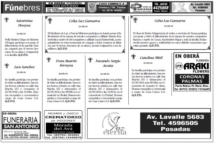 Fúnebres del lunes 23 de mayo de 2016