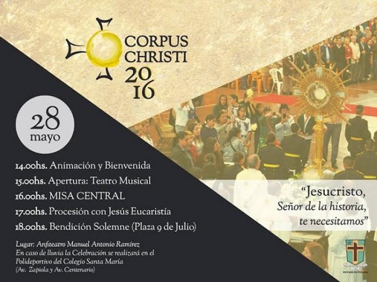 El sábado 28 de mayo, en el anfiteatro Manuel Antonio Ramírez de Posadas y bajo el lema 2Jesucristo, Señor de la Historia, te necesitamos", se realizará la celebración oficial de la Solemnidad de Corpus Christi.La actividad iniciará a las 14 con animación musical y bienvenida. A las 15 se realizará un teatro musical. A las 16 horas será la celebración de la Santa Misa, que estará presidida por el Obispo de la Diócesis de Posadas, Juan Rubén Martínez, y será concelebrada por sacerdotes de la ciudad capital y Garupá.Finalizada la misa, cerca de las 17, comenzará la Procesión con Jesús Eucaristía por las calles de la ciudad hasta la plaza 9 de Julio, donde -en el atrio de la Catedral "San José", se realizará la Bendición Solemne con el Corpus Christi.En caso de lluvia las actividades se llevarán a cabo en el mismo horario en las instalaciones del polideportivo del Instituto Santa María, ubicado en avenidas Zapiola y Centenario.Cabe aclarar que ese sábado por la tarde, todas las misas de la Zona Posadas Centro y Gran Posadas quedan suspendidas.