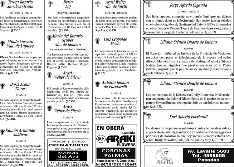 Fúnebres del martes 24 de mayo de 2016