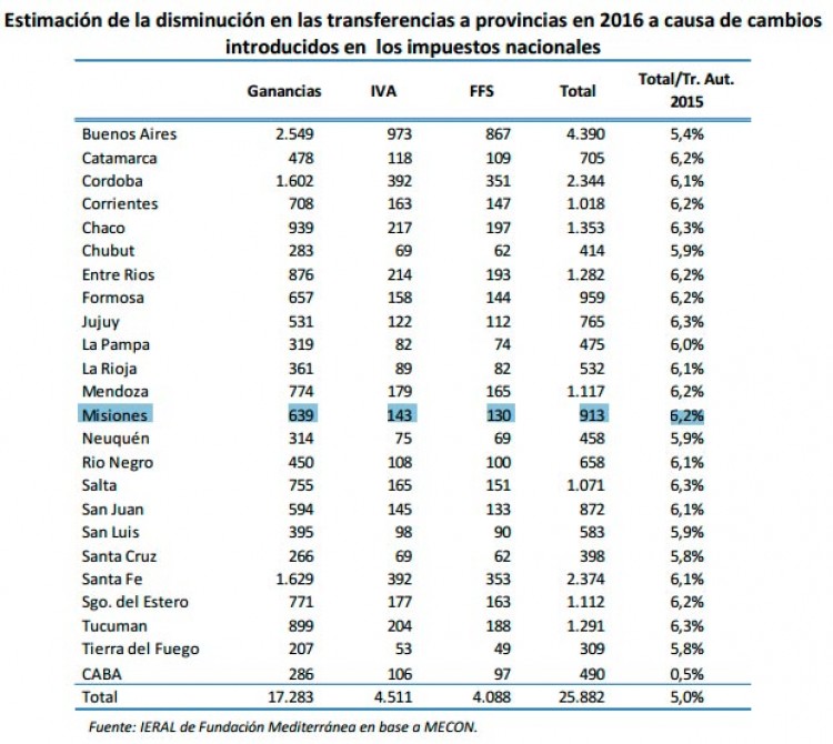 Este año se han producido varias novedades en términos de impuestos y su distribución entre Nación y Provincias, ya sea por cambios en impuestos nacionales que se comparten con provincias (Ganancias, Derechos de exportación e IVA), como por el arreglo ahora alcanzado para comenzar la devolución gradual a provincias de la detracción del 15% a la coparticipación que desde 1992 va a la Anses.Al comparar lo que cada jurisdicción pierde y lo que gana, nos encontramos con que algunas recibirán más recursos que el año pasado, en términos reales, pero Misiones recibirá menos, ya que los fondos que llegarán serán mayores pero no alcanzarán a compensar la inflación y el crecimiento de los gastos. Esta conclusión se obtiene del informe Foco Fiscal, de la Ieral, elaborado por Marcelo Capello, Néstor Grión y Benjamín Castiglione.Respecto a cambios en impuestos que se produjeron este año, se trata especialmente de la suba del mínimo no imponible en Ganancias, la quita del IVA en la canasta alimentaria para jubilados, pensionados y beneficiaros de programas sociales y la disminución en la alícuota de los derechos de exportación. Tales medidas provocan un costo fiscal implícito para las provincias de cerca de 26 mil millones de pesos, equivalente a 5% de las transferencias automáticas recibidas en 2015.En este informe se estima el efecto neto de dichos cambios sobre los recursos que van a provincias y los que quedan en Nación.En 2015 las provincias recibieron en concepto de transferencias automáticas $515.112 millones. Estos recursos están conformados por la coparticipación de impuestos, los ingresos por leyes especiales y por el Fondo Federal Solidario (FFS, en base a exportaciones del complejo sojero). Además, recibieron transferencias discrecionales por alrededor de $80 mil millones.Se espera para este año una inflación del 36% (promedio entre el área metropolitana y el interior) y una caída del PIB del -1%.En mayo ya se ha notado la caída de las transferencias, ya que el global se achicó cerca de 6%, según otro informe especializado, elaborado por Economía y Regiones.En el caso de Misiones la merma fue de 15% comparada con la primera quincena del 2015. La provincia recibió 641 millones de pesos en estos primeros 15 días del mes y en el mismo tiempo del año pasado había recibido $760 millones. Esto se debe a la menor recaudación por la baja en la actividad económica, principalmente la modificación del mínimo no imponible de Ganancias.Según la consultora, en la segunda parte del mes, esta caída se compensará en parte y la percepción total de Misiones para el presente mes en concepto de Coparticipación terminará siendo de 1.745 millones de pesos, un 29,5% superior al mes de mayo (completo) del año anterior.Sin embargo, seguirá siendo una percepción menor al índice de inflación real, que hoy se ubica en torno al 36-40% anual. Es decir, en términos de poder adquisitivo, Misiones estará recibiendo menos dinero porque la inflación se va “comiendo” a las transferencias.Devolución de coparticipaciónTambién se han producido novedades en los criterios de reparto de impuestos nacionales que incrementan los ingresos provinciales este año. Por caso, las provincias lograron una devolución de 3 puntos porcentuales de los 15 pp de la masa coparticipable que se desvía a Anses desde el año 1992. Serán 3 pp cada año hasta completar los 15 puntos.Según Ieral, las provincias que aceptaron el convenio para recuperar en 2016 un 3% de la coparticipación, tienen además la posibilidad de obtener un préstamo del Fondo de Garantía de la Anses por otros 6 puntos de la citada detracción del 15% para Anses. Si todas las provincias hicieran uso de dichos préstamos, tendrían casi $70 mil millones adicionales para 2016 (entre mayores transferencias y préstamos), un 13,6% de las transferencias recibidas en 2015.Cuatro jurisdicciones tendrán ingresos por coparticipación con importantes subas en 2016: 1) Córdoba, Santa Fe y San Luis, que han sido beneficiadas en diciembre pasado por el fallo de la Corte Suprema que le reintegra el 15% de una sola vez, y 2) Caba, al modificarse arbitrariamente su coeficiente secundario de participación (de 1,4% a 3,75%), con el traspaso de la Policía Federal a dicha jurisdicción.Menos que la inflaciónEn base al crecimiento real previsto para de la economía en 2016 (-1%), inflación (36%) y la devaluación ocurrida en la moneda local, y teniendo en cuenta las modificaciones ya señaladas en la política fiscal (impuestos y sus criterios de distribución), se espera que la masa coparticipable crezca un 32,3% en 2016.En resumen, considerando el total de transferencia automáticas a provincias, se destaca que las provincias beneficiadas por el Fallo de la Corte y Caba tendrán un incremento nominal del orden del 47% en sus envíos, la suba para Buenos Aires será del 36% y en el resto de provincias de cerca del 35%. Esto es, con los cambios consolidados, las transferencias a cuatro jurisdicciones tendrán un fuerte aumento en términos reales en 2016, en el caso de Buenos Aires estará a la par de la inflación y en el resto de provincias se ubicarán un punto por debajo de la inflación anual.