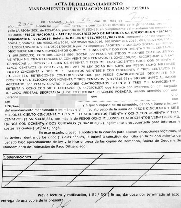 La Administración Federal de Ingresos Públicos (Afip) inició una causa judicial y reclamo contra la empresa Electricidad de Misiones SA por una deuda por no haber depositado fondos por más de 56 millones de pesos, correspondientes a aportes patronales, impuestos y aportes previsionales.Los trabajadores temen -como ocurrió el año pasado- que el organismo recaudador embargue las cuentas de la empresa donde recauda el dinero del pago de boleta de los usuarios y no se pueda pagar el sueldo de los 2.500 empleados.El año pasado ya había ocurrido una situación similar, pero no fue la Afip la que embargó la cuenta, sino la Federación Nacional de Luz y Fuerza. Los trabajadores sufrieron una demora de diez días en cobrar sus salarios, mientras la empresa negoció un compromiso de pago con la Federación y destrabó el embargo.Como puede verse en la imagen, la empresa recibió una cédula de notificación del fisco nacional demandando $ 56.153.438,83 con más de $8.423.015,82 legalmente presupuestados para intereses y costas.La empresa eléctrica de Misiones como agente de retención de impuestos tendría que haber depositado el valor de esa retención impositiva y no lo hizo. Se desconoce a donde fue a parar el dinero pero representa una nueva muestra de los manejos irresponsables y turbios que lleva adelante el presidente Sergio “Pity” Ferreyra hace siete años, con el consentimiento del influyente Sindicato de Luz y Fuerza, que conduce Julio Héctor “Cachilo” Rodríguez.En detalles, los montos que reclama la Afip y que constan en la intimación son: Aportes de Seguridad Social por la suma de $19.915.052,33, contribuciones de seguridad social por $22.421.150,22, Sicore-impuesto a las ganancias por $773.412,75, Retenciones artículo 79 por $8.152.626,53, Retenciones contribuciones de seguridad social por $ 417.218,93 y Sicore impuesto al valor agregado por $4.473.978,07.Todas estas cifras suman un total de $56.153.438,83 que tuvieron un destino incierto y son reclamados por la Administración Federal de Ingresos Públicos.Delito tributarioDe acuerdo al régimen penal tributario Ley 24.769, en su título I, indica que “será reprimido con prisión a dos a seis años el agente de retención o percepción de tributos nacionales que no depositare, total o parcialmente, dentro de los diez días hábiles administrativos de vencido el plazo de ingreso, el tributo retenido o percibido, siempre que el monto no ingresado superase la suma de diez mil pesos ($ 10.000) por cada mes”.Asimismo, el artículo 9, referido a la “Apropiación indebida de recursos de la seguridad social”, señala que “será reprimido con prisión de dos a seis años, el agente de retención de aportes del sistema de seguridad social nacional que no depositare, total o parcialmente, dentro de los diez días hábiles administrativos de vencido el plazo de ingreso, los importes retenidos, siempre que el monto no ingresado superase la suma de cinco mil pesos ($ 5.000) por cada período”.