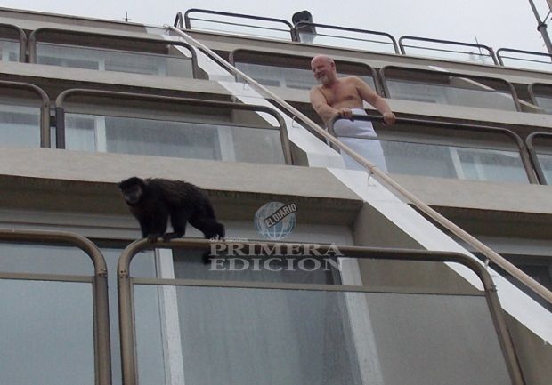 Los visitantes y turistas del hotel internacional Sheraton de Puerto Iguazú se vieron sorprendidos una vez más por una manada de monos que recorrieron el establecimiento en busca de comida, e incluso algunos ingresaron a las habitaciones y se apoderaron de distintos alimentos que encontraron a su alcance.Por ejemplo, uno de los visitantes hospedados en el hotel salió en toalla al balcón y manifestó que uno de los primates ingresó a su habitación, abrió la heladera y sacó una caja de jugo.Luego, el personal del hotel hizo sonar varas metálicas sobre los barandales de edificio para ahuyentar a la manada de monos silvestres, quienes huyeron con en botín y se ocultaron en la espesura del monte del Parque Nacional Iguazú.       Fotos: Gentileza Raúl Saucedo