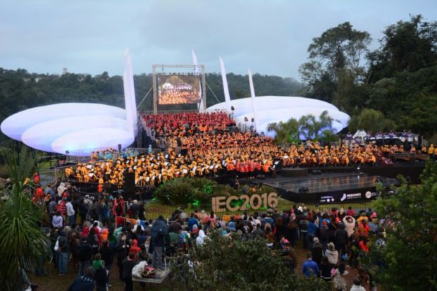 Luego de suspenderse el sábado por mal tiempo, la jornada dominical sí permitió disfrutar de una gala que comenzó a las 16:00 en el hotel Sheraton, dentro del Parque Nacional Iguazú, con miles de personas que enfrentaron no solo el frío y la llovizna, sino también el complejo acceso debido a la cantidad de vehículos agolpados en el acceso al predio.El escenario tuvo su marco imponente con el entorno natural y las Cataratas de fondo para que puedan ser apreciadas por los visitantes que llegan todos los años de todas partes del mundo.La noche se abrió con la historia de romántica de Romeo y Julieta con la obra Montescos y Capulescos bajo la batuta del director Eric du Fai, quien dirige la orquesta Manitos de Francia. Luego siguieron con la historia de Irupe Gonzalez, representado por un vals “La viuda Alegre” interpretado por la orquesta que dirije el maestro Norberto García de Argentina.El publico disfrutó de cada una de las interpretaciones, una de las cuales fue el tema "Singing in the Rain" (cantando bajo la lluvia) por la orquesta de Perú, en sintonía con las inestabilidad meteorológica que había en ese momento.El concierto siguió con la orquesta “Arpas Paraguayas”, la cantante argentina Nadia Zollofer y la interpretación del Himno Nacional Argentino por parte de las veinte orquestas del mundo presentes en el festival. El cierre tuvo un magnífico final con la interpretación de “El mensú” de Ramón Ayala y con el anuncio para un nuevo reencuentro el año que viene en la octava edición del "Iguazú en Concierto".(LEA MÁS DETALLES EN LA EDICIÓN IMPRESA DEL LUNES 30 DE MAYO)