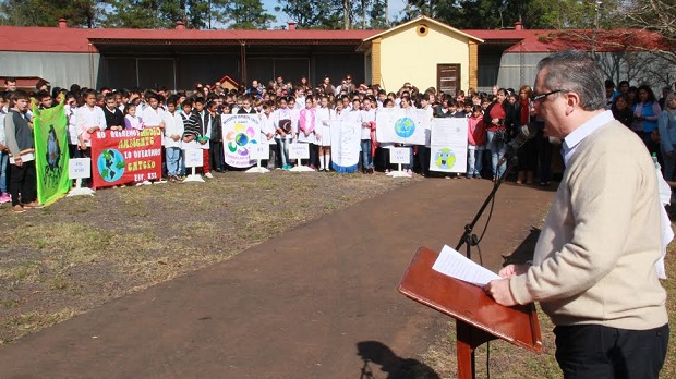 "Es suelo misionero, es nuestro", enfatizó el Gobernador, quien reiteró que su Gobierno no permitirá que se corra "un metro" de la frontera ecológica de Misiones.Lo digo con máximo respeto pero también con máxima responsabilidad de misionero: escuché que la EBY va a entregar a Parques Nacionales 6 mil hectáreas en Campo San Juan, en la costa del Paraná. Yo les pido desde Alem, delante de los alumnos que han prometido el cuidado del medio ambiente, que reflexionen. Que dejen esas 6 mil hectáreas para que las cuidemos los misioneros. Es suelo misionero, eso es nuestro. Se los digo sin ánimo de polémica y con el máximo respeto. Piénsenlo bien. En nombre de los chicos se lo pido", exclamó el Gobernador ante alumnos, docentes y vecinos de la localidad, en el marco de la ceremonia de promesa de cuidado del medio ambiente que, por Ley, la realizan alumnos de séptimo grado de los establecimientos escolares misioneros.Se trató de un emotivo acto en el que a través de diversas acciones simbólicas, los estudiantes expresaron su decisión de defender la ecología. En este sentido, se plantaron árboles testimoniando el compromiso asumido. Y también los adultos reafirmaron la voluntad de dar ejemplo de responsabilidad social.En el predio en el que Alem desarrolla anualmente la fiesta de la Navidad, se dieron cita las autoridades, encabezadas por el gobernador Hugo Passalacqua; el intendente anfitrión, Diego Sartori; la ministra de Ecología, Verónica Derna; de Educación, Ivonne Aquino; y otras autoridades provinciales, municipales y legislativas."Esta promesa que hicieron de cuidar el medio ambiente, de preservarlo, tiene para los misioneros un valor particular. Esto es una ley, la Ley VI-137. Esta ley no es que ocurre en todo el país, no es que ocurre en todo el mundo, quiero que lo sepan. Misiones fue la primer provincia en Latinoamérica en hacer una promesa de cuidado y de compromiso con el medio ambiente. Somos los primeros. Ahora se hace en Colombia, Chile, se hace en México a partir del año pasado. Nosotros hemos dado el ejemplo al resto del mundo, los misioneros sencillos y humildes como somos", remarcó el Gobernador en su discurso."Este acto de promesa para mi tiene un valor patriótico, lo comparo con la promesa a la bandera, con los actos patrios, tiene el mismo significado. Ecología viene de ‘ekos’, que significa casa, lo que estamos haciendo es cuidar nuestra casa, lo que estamos haciendo es prometer que vamos a cuidar nuestra casa, nuestra naturaleza, que es el aire, el agua, son los árboles. Y por qué los misioneros tenemos tanta pasión en el cuidado, por qué fuimos la primer provincia del país en tener un Ministerio de Ecología? Porque nosotros, los que estamos acá y sobre todo ustedes que han hecho un compromiso recién nos toca tutelar, cuidar el 52 por ciento de la biodiversidad de la Patria", insistió el mandatario."Tenemos esa responsabilidad y mientras estemos nosotros al frente del Gobierno no se va a correr ni un metro la frontera ecológica de la provincia de Misiones. Yo los felicito sinceramente a los docentes que les transmiten estos valores, a las autoridades municipales y a las autoridades de Ecología, me parece un gesto maravilloso", recalcó Passalacqua.Además de la toma de la promesa por parte del Gobernador, los alumnos posteriormente recibieron un diploma que acredita el compromiso asumido. La cálida ceremonia fue acompañada con la presentación del reconocido músico y compositor Danilo Santinelli.Fotos: Prensa Gobernación