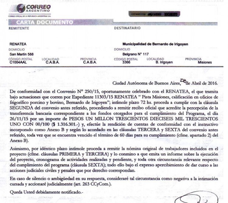 Varias investigaciones que persiguen pistas sobre supuestos hechos de corrupción del gobierno kirchnerista llegan a Misiones y salpican muy de cerca a funcionarios de la renovación. En la última década, los organismos nacionales manejados por kirchneristas enviaron cientos de millones de pesos a Misiones y ahora que están en manos del Frente Cambiemos, como los números no cierran, han iniciado rigurosas auditorías internas y empezaron a exigir la rendición de cuentas de todos los millones que giraron en el pasado. Los que ya detectaron desmanejos directamente fueron a la Justicia y presentaron denuncias.La ola no sólo alcanza a Misiones, sino que también implica a otras provincias que tuvieron gobernadores kirchneristas y se beneficiaron con fondos que rindieron poco y nada.Pero en el caso de Misiones hay varias investigaciones en marcha y, hasta ahora, la buena relación que intenta entablar la renovación con el macrismo no alcanza para frenar los requerimientos de rendición de cuentas y las investigaciones iniciadas.Renatea en IrigoyenLas nuevas autoridades del Renatea enviaron por lo menos cuatro cartas documento entre abril y mayo a la Municipalidad de Irigoyen para que rinda cuentas de más de dos millones de pesos que llegaron en la gestión anterior, del polémico exintendente Edgardo “Chichín” Aquino.Se le exige que en un plazo de 72 horas rinda cuentas de los siguientes envíos: 86.012 pesos el 1 de diciembre de 2015 para el “Programa de Fortalecimiento de Escuelas Vinculadas al Sector Agrario, Escuela Nº 782, Paraje Tres Vecinos”; otras dos partidas de 239.600 pesos que llegaron el 28 de agosto y el 19 de octubre para el “Programa Cuidar”.En otra carta se exige la rendición de 1.316.301 pesos que se transfirieron el 26 de noviembre pasado para el Programa “Pista Misiones, Calificación en Oficios de Frigorífico Porcino y Bovino”; y finalmente se intima que rinda 400 mil pesos correspondientes al “Programa Renatea en tu Municipio” que se depositaron el pasado 26 de noviembre de 2015.Algunas de las intimaciones fueron rendidas por el nuevo intendente pero la mayor parte no porque no se cuenta con la documentación, informó una fuente cercana a la Intendencia.El concejal Silvio Novelino (UCR) hace más de un mes había realizado un pedido de informes y la apertura de una comisión investigadora a la gestión de Aquino por éstos y otros manejos poco claros de los fondos públicos por parte del exintendente. Novelino realizó su propia investigación hallando numerosas irregularidades, las cuales detalló en un informe y elevó al Concejo Deliberante. En ese marco, el balance del presupuesto 2015 de Aquino fue desaprobado por 5 votos contra 2 en el cuerpo deliberativo.Las exigencias del Renatea forman parte de una auditoría que están realizando las autoridades sobre presuntas irregularidades y diversas situaciones llamativas. “El Renatea no tuvo control alguno en sus casi cuatro años de existencia. No se presentaron balances contables, no se aplicaron los procesos de auditoría interna ni tampoco se realizaron los estados contables de los ejercicios 2013/2014 y 2015”, denunció Ramón Ayala, subgerente general a cargo del organismo.“En las rendiciones de cuentas por el uso de los fondos transferidos se detectaron presupuestos falsos de proveedores que nunca se presentaron a los concursos de precios, idénticos proveedores que resultaban siempre ganadores en los concursos, presentación de facturas por gastos no realizados y servicios no prestados, además de rendiciones de gastos por conceptos ajenos a los convenios.La pista de Aníbal FernándezLa Oficina Anticorrupción (OA) presentó una denuncia penal contra el exjefe de Gabinete de la Nación, Aníbal Fernández, quien recibió un subsidio de 56 millones de pesos en su rol de presidente de la Confederación Argentina de Hockey (CAH) para la construcción de canchas para la práctica de ese deporte. Según publicó el diario La Nación, de 23 canchas originales planificadas, sin mucho detalle de dónde serían construidas, se pasó a 46, pero, de acuerdo con los datos reunidos por la OA, sólo tres de ellas se habrían erigido. “No firmé el contrato como Jefe de Gabinete y no firmé como presidente de la CAH”, dijo Fernández, pero no mencionó que su nombre figura en el encabezado del acuerdo porque era presidente pero en licencia.Según dirigentes políticos del deporte misionero, dos de las canchas estaban destinadas a Misiones y debían construirse una en Posadas y la otra en el interior, según una promesa de palabra que había realizado Aníbal Fernández en 2013 cuando vino a Misiones y se reunió con dirigentes y puntualmente del hockey provincial. Con esa promesa se llevó el voto de la Federación Misionera de Hockey para lograr la presidencia de la Confederación Argentina.Si la investigación avanza y la pista llega a Misiones -existen muchas posibilidades de que esto ocurra- los investigadores podrán peinar la provincia de punta a punta pero no encontrarán la pista prometida. No sólo Fernández está complicado sino que funcionarios del gobierno clossista también.Subsidios que no se rindieronLa secretaria de Asuntos Municipales, Aída Ayala, estuvo hace diez días en Posadas y reveló que hay municipios misioneros que no recibirán subsidios para obras ni programas sociales porque no rindieron los gastos de los fondos recibidos en años anteriores.Aunque evitó dar nombres, la funcionaria nacional indicó que “en Misiones, hay municipios que no lo hicieron y hay otros que están trabajando muy bien con los fondos nacionales. Los que recibieron y no rindieron, deben hacerlo”. “Nosotros tenemos programas que son subsidios como ‘Mi Pueblo’ y otros. Pero, cuando el Municipio recibe el dinero, después tiene que decir en qué lo gastó y si no lo rinde, no puede seguir recibiendo el beneficio. La realidad es que todos los intendentes deben rendir los subsi