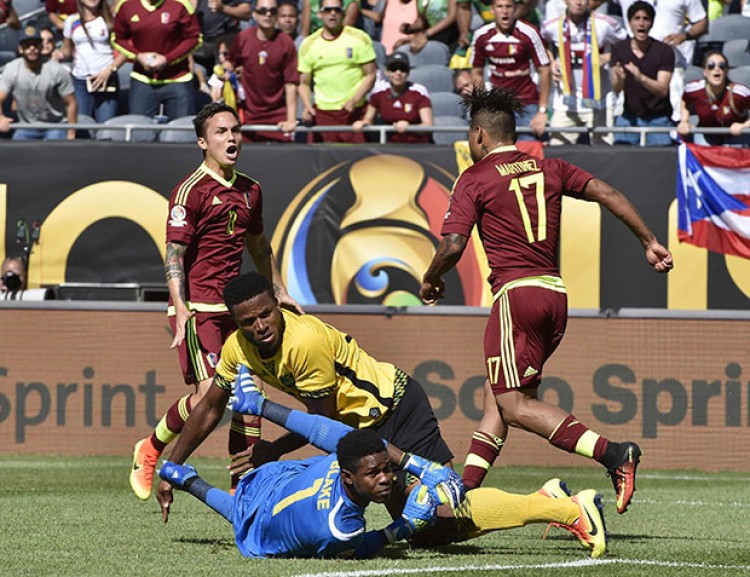 Josef Martínez, a los 15 minutos del primer tiempo, marcó el único tanto del cotejo, que le permite ilusionarse a los venezolanos con el pase a los octavos de final. Además, a los 23 minutos de la etapa inicial, Rodolph Austin vio la tarjeta roja en Jamaica, por una plancha sobre el venezolano Tomás Rincón.Si bien el elenco ‘vinotinto’ se mostró un poco mejor a durante los 90 minutos, sobre todo cuando se conectaron Salomón Rondón, Martínez y Alejandro Guerra, Jamaica le hizo pasar varios sofocones en su debut, pero falló en momentos claves para sumar un punto y se quedó con las manos vacías. El conjunto centroamericano salió de entrada con mucha intensidad, poniendo pierna fuerte que lo llevó a quedarse pronto con un hombre menos (21m. Austin), y un interesante tandem ofensivo compuesto por Giles Barnes y Clayton Donaldson, quien probó con un gran disparo en el que se lució Daniel Hernández; de esa jugada, vino un córner en el que cabeceó Je-Vaughn Watson y la pelota dio en el travesaño. Sin embargo, una mala salida en el mediocampo, le permitió recuperar el balón a la ‘Vinotinto’ con toda la defensa abierta, y Josef Martínez estableció la ventaja inicial, tras una gran asistencia de Alejandro Guerra. En medio de un contexto completamente favorable, los conducidos por Dudamel se despertaron e intentaron acrecentar la distancia en el tanteador, aunque con mayor deseo que caudal futbolístico, por lo que todo finalizó en arremetidas que se esfumaron cerca de la zona de peligro. La historia se repitió en el arranque del complemento, a los 5 minutos, cuando Michael Héctor estrelló un remate en el palo izquierdo de Hernández, que sólo atinó a ver cómo lo sobrepasó la ‘redonda’. Venezuela jamás salió del libreto, se conformó con la mínima ventaja y lo sostuvo muy cerca de su arquero, por lo que sufrió innecesariamente hasta el pitido final del peruano Víctor Carrillo. Fuente: Agencia de Noticias Télam