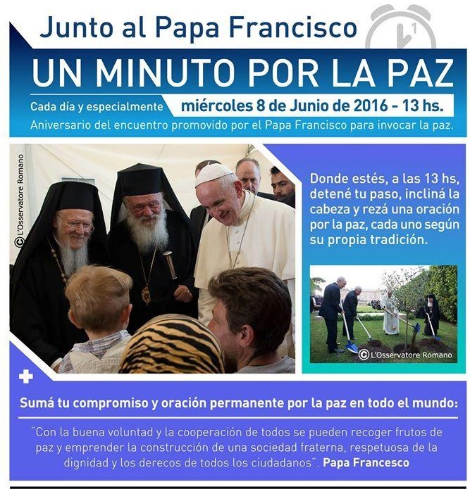 Buenos Aires (NA). La Conferencia Episcopal Argentina (CEA) invitó para este miércoles a las 13:00 a realizar un alto en las actividades para rezar en "Un minuto por la paz".Con ocasión del segundo aniversario del histórico encuentro entre el Papa Francisco y los presidentes de Israel y Palestina, que se celebró en el Vaticano, la CEA, a través de la Comisión Nacional de Justicia y Paz y la Acción Católica Argentina promueven esta "iniciativa dirigida a todos los hombres y mujeres de buena voluntad que quieran sumarse a un gesto concreto por la paz"."La idea es que este miércoles, a las 13.00, cada persona pueda detenerse un momento, durante un minuto, rezando cada uno según su propia tradición. Podremos hacerlo solos o en grupo, en nuestros hogares, lugares de trabajo, de estudio, o compartiendo una celebración en el templo", sostuvo la invitación. Además se agregó que "queremos ofrecer a todos esta oportunidad, este gesto, para animar la oración permanente y el compromiso con la Paz y la Misericordia, con la intención especial por los refugiados que sufren cotidianamente las consecuencias de la violencia". La iniciativa cuenta con la adhesión de diversas instituciones del país como la Comisión Episcopal de Ecumenismo, Relaciones con el Judaísmo, el Islam, y las Religiones, Consejo para la Libertad Religiosa, DEPLAI- Departamento de Laicos, Diálogo Ciudadano, Foro de Habitantes a CiudadanosCentro Islámico de la República Argentina, Red Solidaria, entre otras.En varias diócesis del país, las parroquias y colegios repicarán las campanas de sus templos, a las 13:00, para acompañar Un Minuto por la paz, e invitaron a sus pares a unirse a esta iniciativa.