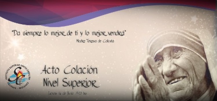 La comunidad educativa del Instituto Santa Catalina invita a la comunidad a su acto de colación del Nivel Superior, que tendrá lugar en las instalaciones del establecimiento el próximo 16 de Junio a las 19:00 bajo el lema "Da siempre lo mejor de ti y lo mejor vendrá", una frase de la Madre Teresa de Calcuta. Programa-Bienvenida-Celebración de la Palabra-Himno Nacional Argentino-Canción Oficial "Misionerita"-Palabras de un profesor-Palabras de un egresado-Números artísticos-Entrega de Certificados-Cierre La Promoción III de Técnicos Superiores en Laboratorio Químico-Biológico está integrada por: Fernanda Ane, Miriam Elizabeth Carisimo, Marcela Alejandra Duarte, Hilda Luciana Marín, Giuliana Lucía Miranda, Silvia Gabriela Orique, Karina Elizabeth Rivas, Macarena Elisa Yaworski, Adrián Ramón Curvello Delfiock, José Gabriel Talavera, María Melania Martínez Meaurio, Carolina Gisela Monjes, Silvana Rafaela Desconsi. La Promoción V de Técnicos Superiores en Administración y Gestión de PyMES y Cooperativas la componen: Jésica Lorena Batista y Victoria Soledad Rodríguez Ocampo.
