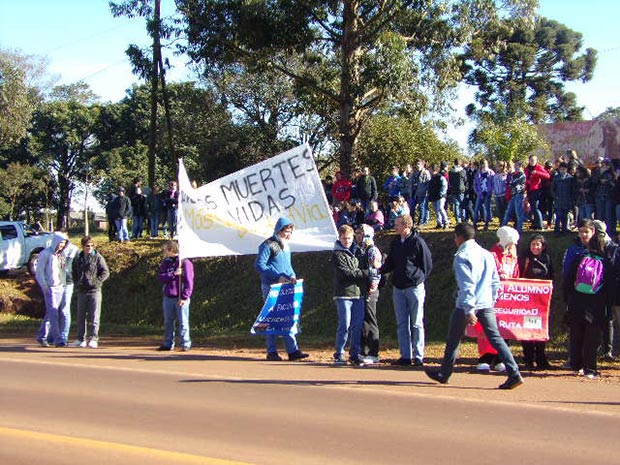 El fallecimiento del alumno del Instituto de Enseñanza Agropecuaria y Electromecánica 3 de San Vicente el pasado 11 de abril, dejó una cicatriz muy profunda y muy difícil de olvidar en la comunidad educativa de ese colegio. El lunes esa comunidad educativa, acompañada por otros colegios de la ciudad, se volvieron a manifestar exigiendo medidas de seguridad vial sobre la ruta nacional 14.El IEAE de la Capital Nacional de la Madera salió a la ruta al cumplirse los dos meses del fallecimiento de Facundo Radke y piden que Vialidad Nacional construya reductores de velocidad y tomen otras medidas de seguridad vial a lo largo de esa arteria de jurisdicción nacional.Esta vez recibieron el acompañamiento de otros colegios como la Epet 21, la Escuela Normal 13, la Escuela de la Familia Agrícola de esta ciudad y la Escuela 380. La directora del IEAE,  Marina Vega dijo que “ésta no es una manifestación contra alguien, es a favor de la vida. No queremos más alumnos, ni ninguna otra persona fallecida en un accidente de tránsito. Por eso salimos a manifestarnos pacíficamente y sin hacer ningún corte de ruta, ni nada que le moleste a los demás. A los automovilistas le entregamos folletos donde le decimos qué estamos haciendo”.Vega aclaró además que “después del accidente del 11 de abril que le costó la vida a Facundo lo único que conseguimos fueron dos carteles de ‘Peligro Escuela’, nada más. También recibimos la visita de gente de Vialidad Nacional que tomaron datos de la escuela y las características y cantidad de alumnos. Además fueron a todas las escuelas y colegios que están sobre la ruta para tomar los mismos datos. No sabemos qué van a hacer, dijeron algo de hacer colectoras. Nosotros le pedimos medidas de seguridad que resguarden la vida de todos los peatones”.Vega manifestó que “hace mucho tiempo que venimos pidiendo medidas de seguridad vial en la ruta. Lo que pasó con Facundito nos hizo salir a la ruta, pero ya veníamos exigiendo que se haga algo para que los alumnos de nuestro colegio puedan estar seguros cuando debían salir para ir a sus casas o cuando van al colegio. Juntamos firmas con otros colegios secundarios y escuelas primarias que están sobre la ruta y pedimos que se hagan lomos de burros, puente aéreo o se coloquen semáforos. Algo que sirva para que los peatones puedan trasponer la ruta seguros”.Por último la directora del establecimiento contó que “la seccional Segunda de la Policía viene y se instala acá sobre la ruta casi todos los días a la tardecita, pero no pueden estar siempre. Los alumnos del colegio llegan para entrar a las 7, luego salen a las 12 y regresan por la tarde a las 13.30, luego salen a las 17.30. Aparte hay distintos horarios para las clases de Educación Física. Es imposible que puedan cubrir todo el tiempo”.El defensor del Pueblo y algunos ediles acompañaron la manifestación sobre la arteria nacional, no así las autoridades municipales.