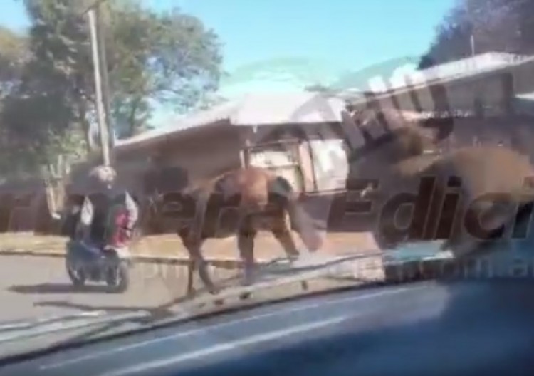 VIDEO: Moto circula por Posadas tirando de un caballo