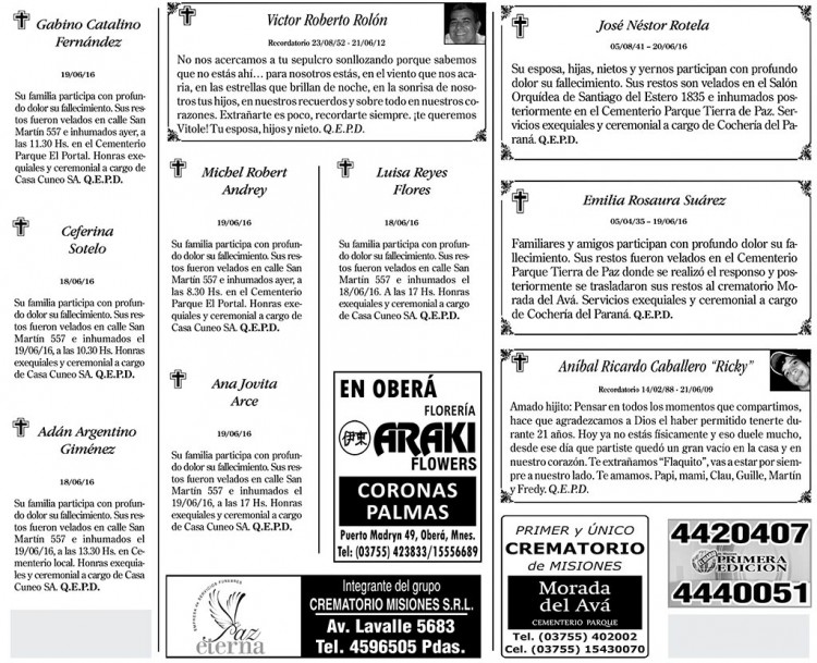 Fúnebres del martes 21 de junio de 2016