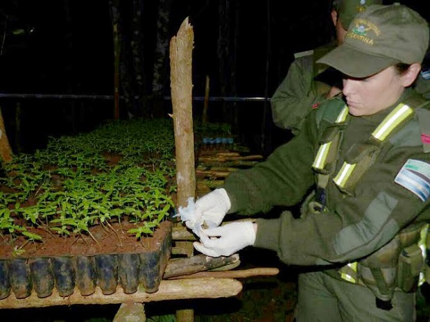 Integrantes del Escuadrón 11 "San Ignacio" de GN efectuaban una patrulla en la localidad de San Gotardo (municipio de Capiovi) cuando escucharon disparos de armas de fuego proveniente del interior del monte. Al adentrarse por los senderos, divisaron a dos hombres que, al oír la voz de alto se dieron a la fuga internándose en la espesura del terreno. Durante el rastrillaje en búsqueda de los involucrados, detectaron a pocos metros una tarima de madera artesanal hecha con ramas y palos con 2.000 plantines de marihuana en bolsitas similares a las que se utilizan para colocar los plantas de yerba mate. El equipamiento fue decomisado, pero no se pudo atrapar a los fugados. Intervino la Fiscalía Federal de Oberá, quien oriento la incautación del estupefaciente y continuar con la investigación para dar con los sospechosos. Fotos: Prensa GN