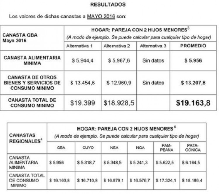 Frente a la imperiosa necesidad de contar con una referencia para actualizar diferentes valores, especialmente los salarios, los trabajadores del Instituto Nacional de Estadística y Censos (Indec) presentaron un nuevo ejercicio técnico que dictaminó que un hogar constituido por una pareja con dos hijos menores en la Región NEA, a la cual pertenece Misiones, la Canasta de Consumos Mínimos es de 16.979 pesos, mientras que en Buenos Aires la cifra es de 19.1638 pesos, al 31 de Mayo de 2016.La metodología propuesta utiliza los siguientes elementos: la estructura de las canastas del Indec previas a la intervención, las dos últimas Encuestas de Gasto de los Hogares, el Índice de Precios al Consumidor (IPC) y las Paridades de Poder de Compra del Consumidor (PPCC) realizados también con anterioridad a dicha intervención, la estructura de la Canasta relevada en el 2008 por la Dirección de Estadística de la Ciudad, la metodología de actualización de la composición de la canasta utilizada y probada por ese equipo técnico, que replicó y desarrolló avances que en Indez se habían iniciado, la evolución de los IPC de las provincias que siguieron publicando sus propios datos con autonomía del INDEC central y las metodologías de determinación de la Pobreza e Indigencia aplicadas hasta la irrupción de la intervención en el Indec.Fuente: ATE