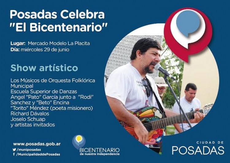 La primera cita es para este 29 de junio, desde las 19, en el Mercado Modelo “La Placita” (Sarmiento y Roque Sáenz Peña), donde se llevará a cabo un destacado show artístico con la presencia de la Orquesta Folklórica Municipal, la Escuela Superior de Danza, el Poeta Misionero “Torito” Méndez, Ángel “Pato” García Trío, Richard Dávalos, Joselo Schuap, artistas invitados y la presencia especial de la Banda Santa Rosa de Encarnación (Paraguay), en el marco de un intercambio cultural binacional.La entrada es libre y gratuita, y están cordialmente invitados todos los vecinos que quieran unirse a los festejos de los 200 años de la independencia.