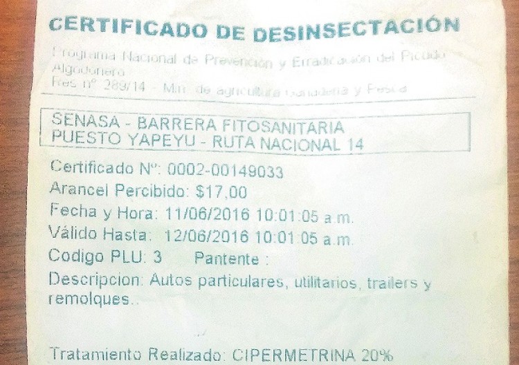 La barrera fitosanitaria instalada por el Senasa en Yapeyú (Corrientes) fue duramente cuestionada por conductores misioneros que habitualmente transitan por la ruta naciunal 14 y deben abonar un arancel por una fumigación que, a los efectos de "barrera", sería "inútil y meramente recaudatoria", según denunciaron ante PRIMERA EDICIÓN.Cansados de ver cómo las tareas de fumigación (se esparce cipermetrina en los neumáticos) es un procedimiento que se cumple únicamente con los vehículos que provienen del Norte del país -y no en sentido contrario-, algunos conductores que transitan por la zona decidieron hacer pública las críticas al procedimiento por el cual deben abonar 17 pesos. “Llama la atención que quienes vienen en el sentido contrario de la ruta (es decir, no desde Misiones) sino desde otras provincias, no les desinfectan los autos. Entonces qué tipo de barrera fitosanitaria estamos hablando. Hacen pensar que son puestos que cumplen nada más que la función de recaudar más que de desinfección”, dijo C. S., un posadeño que va cada tanto hacia esa localidad, y quien pidió resguardo de identidad al exhibir el comprobante.“Más allá del enojo por el cobro de una supuesta fumigación, la crítica alude a que el comprobante señala que se lava el auto con el pesticida, pero en realidad sólo lo arrojan a las ruedas del coche”. “Los vehículos que viajan a 100 kilómetros por hora tienen pocas probabilidades de que se les pegue algún bicho. Cómo vamos a trasladar algún bicho de Misiones a Corrientes manejando a esa velocidad, qué bicho se puede pegar en la rueda”, se indignó el hombre. La barrera fitosanitaria del Senasa en la región tiene dos puestos fijos: por la ruta 14 en Yapeyú y otro por la ruta 12, alejados de los otros centros de control. En su momento se hizo este trabajo en las rutas para controlar al picudo del algodón, “pero realmente llama mucho la atención que un puesto de desinfección para tratar la problemática esté lejos de la zona algodonera”, fue otro de los reclamos. Se preguntó el conductor: “¿Sirve de algo desinfectar sólo los autos que van de Norte a Sur y no de Sur a Norte? Las otras barreras de desinfectación están alejadas a más de dos mil kilómetros de distancia una de la otra. ¿Por qué en la región tenemos dos y el procedimiento se realiza solamente con algunos? Si la tasa afecta al viajero común que cada tanto debe pasar por allí, no me imagino el perjuicio para los camioneros”, prosiguió el hombre.Este Diario intentó contactar sin éxito a las autoridades del organismo de contralor para que den su versión sobre las denuncias vertidas por los lectores.