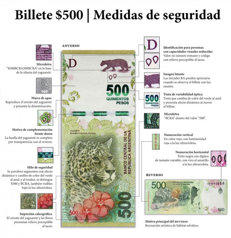 El <a href="http://www.primeraedicion.com.ar/nota/224135/este-jueves-comienza-a-circular-el-nuevo-billete-de-500-pesos-con-la.html">nuevo billete de 500 pesos comenzará a circular a partir de este jueves</a>, y será el primero de la nueva familia de divisas con imágenes de la fauna autóctona de Argentina.Tal como lo anunciara a comienzos de este año el presidente del Banco Central (BCRA), Federico Sturzenegger, el nuevo billete tendrá la imagen de un yaguareté, una elección que fue explicada por el objetivo de que "la moneda nacional sea un punto de encuentro en el que todos los argentinos puedan sentirse representados, y a la vez busca crear conciencia sobre la conservación de la biodiversidad y la preservación ambiental".El nuevo billete fue presentado en un acto realizado este miércoles en el Museo del BCRA, que contó con la presencia de autoridades como el ministro de Ambiente y Desarrollo Sustentable de la Nación, Sergio Bergman, representantes de ONGs vinculadas con el cuidado ambiental y expertos en numismática, entre otros invitados especiales.El nuevo billete, cuyo papel es 100% de algodón con una leve tonalidad verdosa y conserva el tamaño de la Línea Peso, será distribuido progresivamente desde este jueves a través de la red de sucursales bancarias y cajeros automáticos de todo el país.Al igual que el resto de la nueva familia de billetes, coexistirá con la que actualmente se encuentra en circulación, según explicó un comunicado del BCRA.En ese marco, el nuevo billete de 200 pesos entrará en circulación en octubre próximo, y el de 1.000 pesos en 2017.El Banco Central difundió un video donde se explican las características y medidas de seguridad del nuevo billete, parte de una familia de billetes que renovarán los diseños actuales con motivos de fauna autóctona.Las medidas de seguridad del nuevo billete incluyen:-Una marca de agua que representa la imagen del yaguareté y la denominación-Hilo de seguridad que tienen un efecto dinámico y cambio de color del verde al azul y a trasluz se distingue $ 500 y BCRA.-Los motivos principales (yaguareté y flores) están impresos en calcografía y los fondos en offset. Las imágenes son perceptibles al tacto.-Tinta de variabilidad óptica que permite que cambie del color verde al azul y permite el efecto dinámico al mover el billete.-Identificación para personas con capacidades visuales reducidas, y microletra. Tiene el valor en número romano y código con relieve perceptible al tacto.-Tiene el texto "YAGUARETÉ. MONUMENTO NATURAL NACIONAL". Sobre la derecha se lee "BANCO CENTRAL DE LA REPUBLICA ARGENTINA".Fuente: Télam