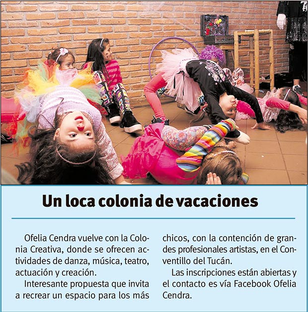 Las vacaciones de invierno comienzan para algunos a mitad de esta semana, pero las propuestas de actividades ya se comenzarán a disfrutar el jueves. El teatro abrió la jugada y el Festival Internacional “Gurises al Teatro” en su tercera edición, llega con funciones recargadas en el Centro Cultural Vicente Cidade. Todos los días a partir de las 18 y entradas a 40 pesos.Nuevamente Ofelia Cendra abre la Colonia Creativa para disfrutar de semanas a puro arte en el Conventillo del Tucán donde, además de jugar y cantar, los chicos aprenderán ejercicios circenses y de clown, con actividades que irán desde la danza hasta las artes plásticas. Inscripciones abiertas en el Facebook de Ofelia Cendra. También el Grupo Alas de Buenos Aires regresa con tres obras de gran éxito en el ambiente infantil. Las mismas estarán en el auditórium del Instituto Montoya, con funciones a las 15.30 y a las 18. Las entradas están en venta en la boletería del instituto.Las actividades incluirán a los adultos con funciones de teatro en Sala Mandové Pedrozo. “Si nos buscan no estamos” seguirá en cartel hasta agosto. La divertida obra teatral “Enredados”, protagonizada por Flor de la V, Osvaldo Laport, Iliana Calabró, Fede Bal, Sebastián Almada, Magui Bravi, Ailén Bechara y Belén Etchart, se presentará el sábado 23 a las 21.30 en el Club Alemán. Entradas en venta en Musimundo (Bolivar 2062).