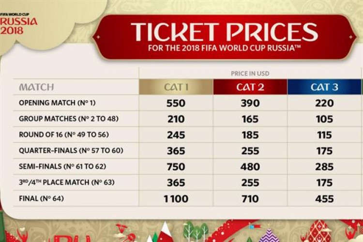 Las entradas más baratas para ver un partido del Mundial de Rusia 2018 costarán 105 dólares (94 euros) y habrá que desembolsar por lo menos 455 dólares para asistir a la final, anunció la Fifa este martes.Las entradas para la final costarán entre 455 y 1.100 dólares.Para los residentes rusos se establecerán tarifas especiales que irán desde los 1.280 rublos (17,8 euros) para los partidos de primera ronda a los 7.040 rublos (98 euros) para la final.