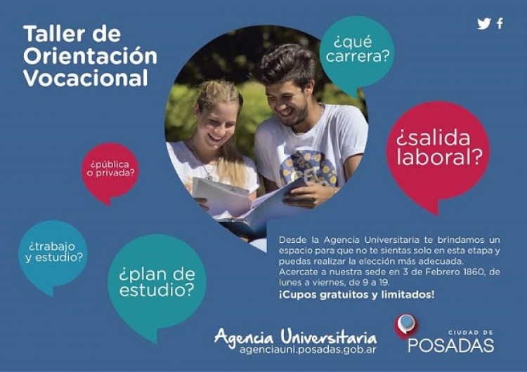 “¿Qué carrera elijo? ¿Pública o privada? ¿Tiene salida laboral? ¿Trabajo y estudio?” son algunas de las preguntas que los estudiantes de los últimos años del nivel secundario suelen hacerse cuando tienen que decidir qué hacer al finalizar la escuela. Para aclarar estas dudas y acompañarlos en el proceso de elección, la Agencia Universitaria de la Municipalidad organiza un taller de orientación vocacional que comenzará a funcionar en agosto.Se trata de una propuesta que consistirá en cinco encuentros. Serán los representantes del Centro de Estudiantes de la carrera de Psicopedagogía del Instituto Antonio Ruiz de Montoya los que coordinarán la actividad junto a los integrantes del espacio municipal.“Esto lo hacemos tras haber firmado un convenio de colaboración con la institución educativa. Demuestra también la necesidad y posibilidad de articular acciones con organismos pensando en un mismo objetivo: acompañar al estudiante en la introducción a la vida universitaria”, explicó la coordinadora de la Agencia Universitaria, Mariela Dachary.Además, destacó que “la idea es que sea un taller completo y que el participante termine sabiendo qué hará cuando termine la secundaria”.Los chicos que quieran aprovechar la oportunidad, deben realizar su inscripción acercándose a la sede ubicada en 3 de Febrero 1860, de lunes a viernes, de 9 a 19.Es importante resaltar que el servicio es gratuito y con cupos limitados, por lo que se insta a los interesados a inscribirse lo antes posible.