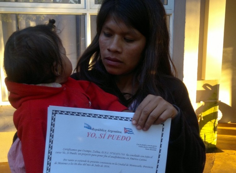De a poco, el porcentaje de personas analfabetas en Misiones se reduce y uno de los programas de alfabetización que más ayuda con ello es “Yo sí puedo”, impulsado por el Gobierno de Cuba, coordinado en la Argentina por la Fundación “Un Mundo Mejor Es Posible” (UMMEP) y a nivel local por la Dirección de Cultura de la Municipalidad de Montecarlo.El miércoles, en la Casa de la Cultura de esta localidad se realizó el acto de cierre de “Yo sí puedo” y contó con la presencia de autoridades provinciales y locales, además de algunos de los 302 egresados que tiene el programa en la localidad desde que comenzó a implementarse en 2009.María, una madre de cuatro hijos oriunda de la comunidad Arroyo Isla, una de las cuatro aldeas aborígenes que tiene la localidad, y que participó del programa, contó a PRIMERA EDICIÓN que “le estoy muy agradecida a esta gente que me enseñó a leer y a escribir que me gusta mucho, además me pone muy contenta porque ahora voy a poder estar más segura para hacer mis trámites”.Dejar el analfabetismo en 100 días Así como María, muchas personas de todos los barrios de esta localidad y de los pueblos originarios, pudieron cambiar sus vidas e iniciar una nueva etapa de mayor libertad a partir de que participaron de este programa que ya se replicó en casi diez millones de personas de treinta países.Según indicó el coordinador general de la Misión Educativa Cubana en Argentina, Jorge Padrón Alegre, “este es un proyecto educativo, una herramienta pedagógica con tres características distintivas: lo primero es que utiliza los medios audiovisuales como la televisión y el video, lo segundo es que es alfanumérico y por último que es totalmente inclusivo para todas las personas mayores de quince años. Se puede aprender a leer y escribir en 100 días, con una clase de media hora por día donde los alumnos con un facilitador solamente ponen el video en el que hay un profesor que guía la clase y se imparten conocimientos sobre historia, geografía, matemática, valores, y demás. Todo esto fue elaborado por científicos cubanos a pedido de Fidel Castro. Las clases fueron grabadas por actores argentinos de modo a mantener los acentos y las tonadas regionales”, explicó.Libre de analfabetismo Para la Unesco, una persona deja de ser analfabeta cuando puede elaborar una carta por sí misma, y con la efectiva implementación de este programa, la localidad de Montecarlo fue declarada también en la ocasión, libre de analfabetismo, reconocimiento que fue recibido por el intendente Julio César Barreto.“Lo más importante de todo esto es la evidencia de que con el saber se pueden derribar enormes barreras. No me puedo ni imaginar lo que debe significar ser adulto y no saber leer; y de repente, poder hacerlo; empieza una nueva etapa que permite igualdad y justicia, que es en definitiva lo que todos buscamos”, expresó el jefe comunal. Por parte, la presidente de la Fundación “Un Mundo Mejor Es Posible” (UMMEP), Claudia Camba, señaló que “estamos muy satisfechos con el número de personas que llegamos a alfabetizar en estos años lo que permitió que este municipio se declare libre de analfabetismo. Pero no son los números lo más significativo, sino el esfuerzo que esto significa y la posibilidad de que esto se pueda extender y replicar en otras localidades de la provincia, principalmente en las comunidades aborígenes”, explicó.El programa lo financia el Gobierno de Cuba en conjunto con la Fundación, por lo que para el municipio que desee aplicarlo los gastos son mínimos. Los interesados en más información pueden ingresar al sitio web <a href="http://www.fundacionummep.org.ar/">www.fundacionummep.org.ar</a>.“Montecarlo tuvo históricamente trabajo con distintos programas de alfabetización en las escuelas, la Asociación de Maestros, Cáritas, y el ‘Yo sí puedo’ es un aporte más”, señaló el coordinador provincial del programa, Carlos Masloski. Destacó que resta 1,5% de la población sin saber leer ni escribir.Aula satélite para Cocuá PotyFinalmente, el director de Cultura del municipio, Anacleto Benítez, se expresó muy satisfecho con los resultados obtenidos con este programa que trascendió por lo menos dos gestiones municipales hasta lograr el reconocimiento de la Unesco. “Lo que saco como conclusión de todo esto es que la educación llegue definitivamente a nuestras aldeas aborígenes, que en nuestro caso tenemos cuatro comunidades. Y en esta semana tuvimos la grata noticia de que el Consejo de Educación creó el aula satélite en la aldea más alejada que tenemos, que es la Cocuá Poty de Arroyo Alto, en cercanías de Fracrán, eso nos llena de felicidad, pero todavía quedan tres comunidades que también necesitan escuelas porque tenemos un gran número de niños que están en condiciones de iniciar su escolaridad, pero esto ya queda en el campo de las autoridades provinciales”, finalizó.