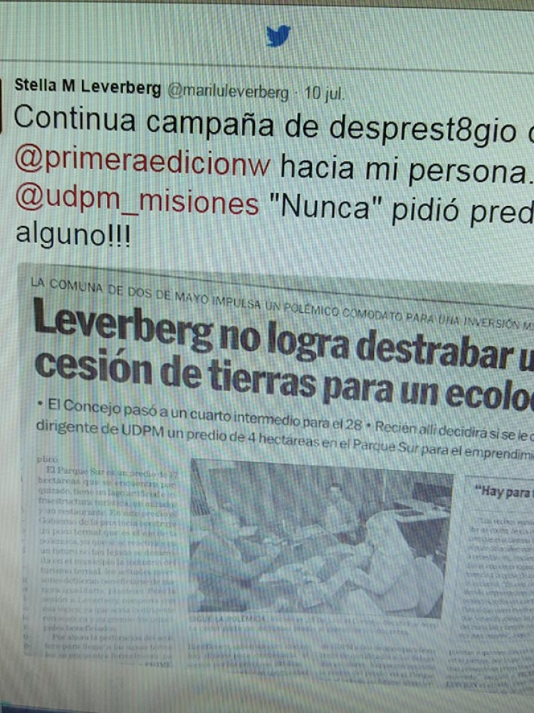 Desde la publicación del informe sobre el freno -ahora permanente- de la cesión del valiosísimo predio de cuatro hectáreas a metros del futuro parque termal que proyecta el gobierno de la provincia con fondos públicos en Dos de Mayo, la dirigente renovadora y Secretaria General de UDPM publicó una serie de posteos en su cuenta de Twitter quejándose por las supuestas inexactitudes de la nota de PRIMERA EDICIÓN y sobre una también supuesta negativa de este medio a su derecho a réplica.Pero la nota formal solicitando ese derecho tiene sello de salida de UDPM el día 12 de julio a las 8.45, lo que indica que durante tres días la dirigente montó una campaña en redes sociales basada en falsedades. “Continúa la campaña de desprestigio en mi contra. UDPM nunca pidió predio alguno”, denunció Leverberg en su cuenta el mismo día de la publicación.Sin embargo, <a href="http://www.primeraedicion.com.ar/nota/225080/dos-de-mayo-al-final-no-le-daran-las-cuatro-hectareas-a-leverberg.html">la información que reprodujo PRIMERA EDICIÓN y que contradice lo aseverado por la dirigente</a>, provino del propio jefe comunal que aseguró que efectivamente solicitaron un predio para el emprendimiento de UDPM “que tuviera papeles” dentro del ejido municipal, a lo que la comuna accedió proponiendo las cuatro hectáreas del Parque Sur.