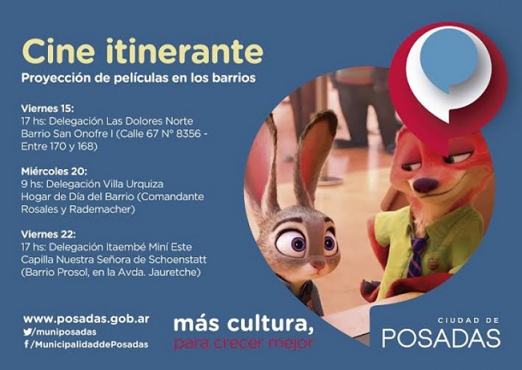 Este viernes 15 de julio, desde las 17, se realizará una jornada de proyección de películas en el Barrio San Onofre; el miércoles 20, a partir de las 9, en el  Hogar del Día, ubicado en Comandante Rosales y Jauretche. Mientras que el viernes 22, el Cine itinerante llegará hasta la Capilla de Schoenstatt, ubicada en el Barrio Prosol sobre la Avenida Jauretche, desde las 17.Por otro lado, el “Cine Gigante” saldrá de gira y se presentará este sábado desde las 18 en el edificio La Costa, ubicado en el cuarto tramo de la Costanera; y el sábado 23, desde las 16, la actividad será en el anfiteatro Ramón Ayala del Barrio Nueva Esperanza, en la intersección de las avenidas Cocomarola y Juan Manuel Fangio.Desde la organización agregaron que “para que nadie se quede sin disfrutar de los films que se proyectan, en la Casa de la Historia y la Cultura del Bicentenario en el Barrio Itaembé Miní también todos los martes y jueves de julio, desde las 16, habrá películas para todos los gustos y totalmente gratis”.