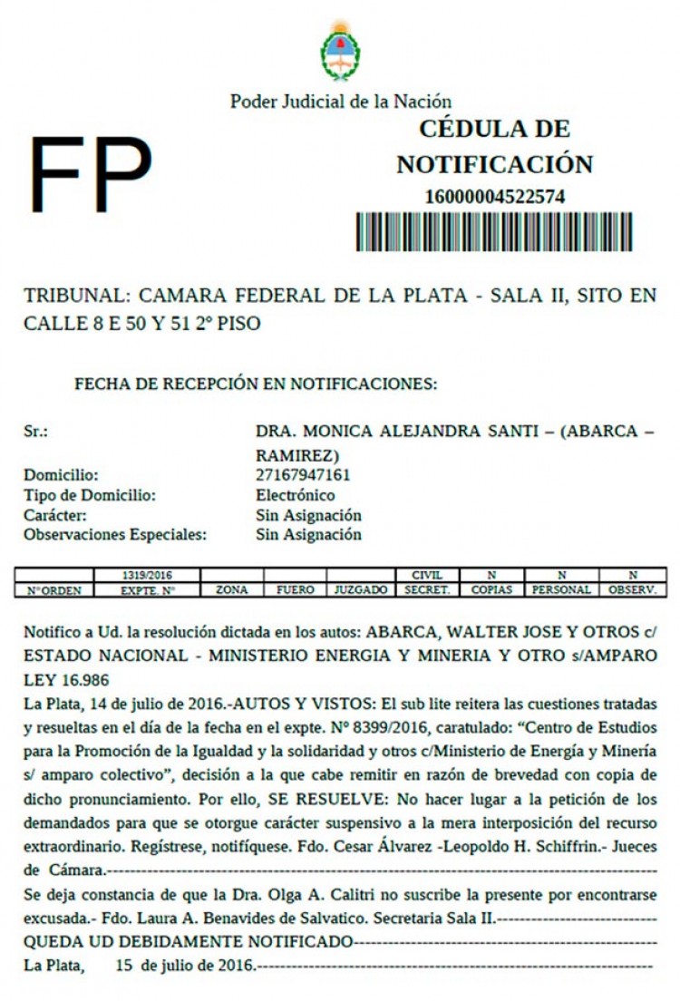 Una semana atrás, el tribunal platense hizo lugar a un amparo iniciado por una entidad de usuarios y anuló el ajuste en las boletas de gas, pero el Gobierno presentó este martes un recurso extraordinario ante la Corte y pidió la suspensión de los efectos de la medida.Sin embargo, los magistrados desecharon el pedido del Gobierno y ratificaron la resolución judicial que obliga a las empresas distribuidoras a mantener las tarifas vigentes hasta marzo pasado, en el marco de un amparo iniciado por el Centro de Estudios para la Promoción de la Igualdad y la Solidaridad (CEPIS). Con el amparo colectivo, esa entidad pidió que deje sin efecto las resoluciones 28 y 31 del Ministerio de Energía y Minería de  la Nación y que se retrotraiga la situación tarifaria a la existente previamente.De este modo, no tendrán validez los aumentos decididos por el Ministerio de Energía, a los que se decidió poner un tope del 400% en el caso de usuarios residenciales y del 500% para los comercios.En su resolución, los jueces decidieron: "No hacer lugar a la petición de los demandados para que se otorgue carácter suspensivo a la mera interposición del recurso extraordinario"."La mera interposición del recurso extraordinario por el Estado Nacional, no afecta la fuerza de la sentencia definitiva de esta Cámara, ni suspende su ejecutoriedad, tal como lo ha sostenido esta Sala en los múltiples caso", indicaron en la resolución los jueces Leopoldo Schiffrin, César Álvarez y Olga Calitri.En el pronunciamiento, los jueces señalaron que el pedido de suspensión de la resolución originaria fue firmado por el ministro de Energía, Juan José Aranguren; María Valeria Mogliani, directora General de Asuntos Jurídicos de esa cartera con el patrocinio letrado de la SubProcuradora del Tesoro de la Nación, Susana Elena Vega.Por otra parte, la Cámara adoptó una decisión idéntica en el caso de las tarifas de electricidad, suspendidas en el ámbito de la provincia de Buenos Aires.   Según un comunicado del bloque de diputados provincial del FPV-PJ, la Cámara ratificó que el freno al tarifazo eléctrico sigue vigente en toda la Provincia de Buenos Aires.La Cámara Federal de La Plata notificó que la cautelar impulsada por ese bloque sigue vigente y, de este modo, desestimó el pedido de efecto suspensivo solicitado por el Estado Nacional y el ENRE.Desde la bancada, señalaron que "si bien el Estado apeló el fallo del tribunal platense para que el aumento de la luz siga en marcha, la sentencia que prohíbe las subas tiene plena vigencia".El pasado jueves 7 de julio, la Sala revocó un dictamen de primera instancia del Juez Adolfo Gabino Ziulu y resolvió "por el término de 3 (tres) meses la suspensión de las Resoluciones del Ministerio de Energía y Minería de la Nación 6/2016 y 7/2016 y la Resolución del ENRE 1/2016 para el ámbito geográfico de la Provincia de Buenos Aires".Fuente: Agencia de Noticias NA