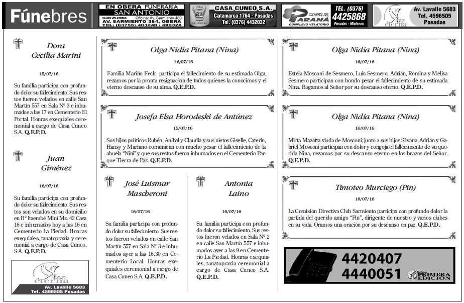 Fúnebres del domingo 17 de julio de 2016