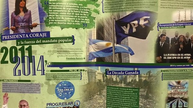 En el suelo se desplegó una lona de varios metros de largo y de ancho que tenía impreso un camino serpenteante con varios casilleros, como si fuera el juego de la oca. Rodeando la lámina, varios chicos observan a un hombre tirar un dado gigante que le indicará cuántos de esos casilleros deberá saltar. “Privatizaciones”, “Precarización laboral”, “Megacanje”, “Soberanía”. Alguno de ésos le va a tocar y tendrá que hablar sobre ello.Según detalla el diario La Nación, la situación, representada en una foto, integra el informe de gestión 2014-2015 de la Subsecretaría de Reforma Institucional y Fortalecimiento de la Democracia que encontró la nueva administración cuando llegó al gobierno.El documento, hallado en un cuarto bajo llave junto a una montaña de material de propaganda kirchnerista, resume en más de cien páginas a qué se dedicó el organismo, al menos en los últimos dos años, mientras estuvo en la órbita de La Cámpora, primero, y del radical cristinista Leandro Santoro -yerno del ex senador nacional Leopoldo Moreau-, después.Adonde iba el organismo se colgaba una gigantografía con el logo “Fortalecimiento de la Democracia” escrito en una tipografía casi idéntica a la que usa La Cámpora para su merchandising. Frente a esa imagen, los asistentes al taller se intercambiaban cartulinas que describían a puro color y con un diseño saturado los principales hechos de los distintos gobiernos de la Argentina desde la última dictadura hasta el segundo mandato de Cristina Kirchner.“Pobreza estructural”, “neoliberalismo” y “privatización” son algunas de las consignas que describen la gestión de Carlos Menem, ilustradas, entre otras imágenes, con la Ferrari roja que le había obsequiado un empresario.“Restitución de derechos”, “Presidenta coraje”, “Década ganada” son las que describen a los gobiernos kirchneristas, acompañadas por una imagen del papa Francisco y algunas tapas de La Nación y Clarín, a las que se criticaba.El informe describe qué se hizo en algunos de los talleres: “Se construyó conocimiento colectivo respecto al reconocimiento de los derechos sociales y la trascendencia de las políticas de derechos humanos (…). Los participantes reconocieron y compartieron la ponderación de símbolos sobre los 31 años de democracia (…). Dichas insignias fueron posteriormente estampadas en banderas, pecheras y/o camisetas mediante la técnica de stencil”.Entre el material que el kirchnerismo no se llevó de la subsecretaría se encontraron sólo dos modelos de stencil: uno con el rostro del Eternauta -ligado por la militancia a la figura de Kirchner- y otro con la frase “héroe colectivo”, que era el nombre de uno de los talleres.En otro capítulo del documento había varias páginas donde figuraban imágenes en miniatura de lo que, según la subsecretaría, se utilizaba como gigantografías en los talleres. Las fotos estaban divididas en grupos de dos que, dispuestas una al lado de la otra, funcionaban como contraste entre lo que estaba bien y lo que estaba mal.Por ejemplo: uno de los pares de imágenes tenía, de un lado, a la militancia delante del Congreso bajo el título “democracia”. Del otro se mostraba un collage con decenas de logos de empresas multinacionales. El título era “corporaciones”.Al mismo tiempo, fiel al estilo confrontativo que el kirchnerismo mantuvo con la prensa, otro de los grupos de imágenes hablaba de “país virtual” y “país real”, mostrando las tapas de Clarín y de Página 12 respectivamente.Fuente: Nexofin