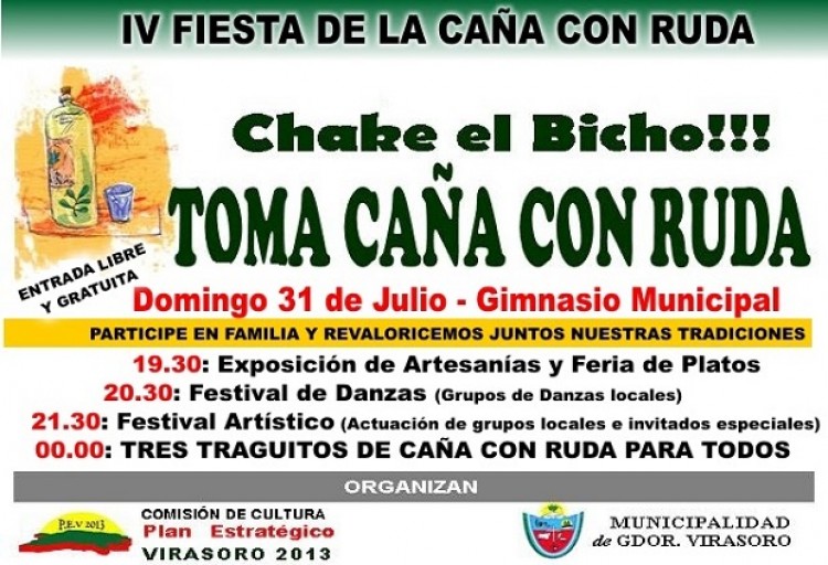 Con variadas actividades, la Municipalidad de Gobernador Virasoro (Corrientes) invitó al tradicional festival que se realiza para recibir el 1 de agosto, día en que se bebe la tradicional caña con ruda. Está prevista una noche con música, baile, comidas típicas, y la prueba del ancestral brebaje.Se trata de la novena fiesta “Chake el bicho, tomá caña con ruda”, que se realizará el domingo 31 de julio a partir de las 19 en el Gimnasio Municipal. Es organizada por la Dirección de Cultura Municipal y el ballet Martín Fierro, con el apoyo de las distintas áreas municipales. Habrá exposición de artesanías, baile y música, participarán los artesanos locales, el ballet Martín Fierro, las bailantas y toda la fuerza del chamamé joven, con la actuación de Amanecer Campero, Grupo Ser-fer, Herencia Tarragosera, Conjunto Virasoro, Iván Gómez, un joven tarragosero correntino, y Che Trío Porá Grupo.El primer minuto del 1 de agosto se compartirán los “tres tragos de caña con ruda”, preparadas de diversas formas: la tradicional o bien con azúcar quemada, miel, cáscara de naranja, anís en grano y algunas novedosas que se presentan en cada edición. Durante toda la noche se difundirá en pantalla gigante todo el significado de esta tradición milenaria y los secretos que tiene prepararla.