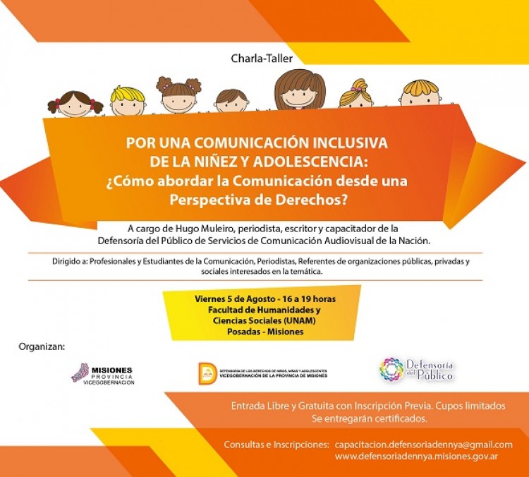 En nuestro país, a partir de la ratificación de la Convención de los Derechos del Niño y de la sanción de la Ley de Protección Integral de Niños, Niñas y Adolescentes (Ley 26.061), se ha reconocido a las niñas, niños y adolescentes como sujetos titulares de derechos, entre los que se incluye el de recibir información y opinión en pluralidad, con contenidos accesibles según su nivel de desarrollo, y el de buscar, investigar y difundir informaciones y opiniones. En este sentido, la Ley de Servicios de Comunicación Audiovisual contempla una serie de previsiones con el fin de garantizar la producción de contenidos audiovisuales respetuosos de los derechos cuya titularidad corresponde a la infancia y adolescencia. Con el objetivo de brindar herramientas para modificar e incluir prácticas orientadas a lograr una comunicación responsable de las niñas, niños y adolescentes; se realizará el viernes 5 de agosto, en la ciudad de Posadas, el taller “Por una Comunicación Inclusiva de la Niñez y Adolescencia: ¿Cómo abordar la Comunicación desde una Perspectiva de Derechos?La actividad es organizada por la Defensoría de Derechos de los Niños, Niñas y Adolescentes de Misiones y se llevará a cabo en la Facultad de Humanidades y Ciencias Sociales de la Universidad Nacional de Misiones, en el Salón de Usos Múltiples de la Facultad de Humanidades y Ciencias Sociales (Unam). Colón 2368 – 1er. Piso – Edificio Juan Figueredo. Entrada libre y gratuita. Se entregarán certificados de asistencia.de 16 a 19 horas.El encuentro estará a cargo de Hugo Muleiro, periodista, integrante de la Dirección de Capacitación de la Defensoría del Público de Servicios de Comunicación Audiovisual de la Nación.¿Qué sabemos de niñez y adolescencia a través de los medios?; ¿cuáles son los temas de los que somos informados y aquellos que no se dan a conocer?; ¿qué implicancias tiene para los medios de comunicación, para el Estado y para la sociedad el marco legal vigente?; ¿cómo incluir la voz de niñas, niños y adolescentes en las organizaciones?; son algunos de los interrogantes y ejes temáticos que se abordarán en el taller. El evento es gratuito y está dirigido a periodistas, comunicadores sociales, referentes de organismos del ámbito público, social, académico y privado que trabajan en infancia y adolescencia o están interesados en la temática.El taller se enmarca en la tarea de formación y promoción que viene llevando a cabo la Defensoría de los Derechos de los NNyA de Misiones tendiente a brindar herramientas a diversos actores sociales para el cumplimiento efectivo de los derechos de la niñez y adolescencia. Para inscribirse o para consultas comunicarse a [email protected]. Es importante la inscripción previa, dado que hay cupos limitados. Se entregarán certificados de asistencia.Para inscribirse, ingresar a <a href="https://docs.google.com/forms/d/e/1FAIpQLSdOPGBzzCogM1MoeTiFtZij7TePO_z1elubC1hXp9Zwku3ldA/viewform">https://docs.google.com/forms/d/e/1FAIpQLSdOPGBzzCogM1MoeTiFtZij7TePO_z1elubC1hXp9Zwku3ldA/viewform</a>
