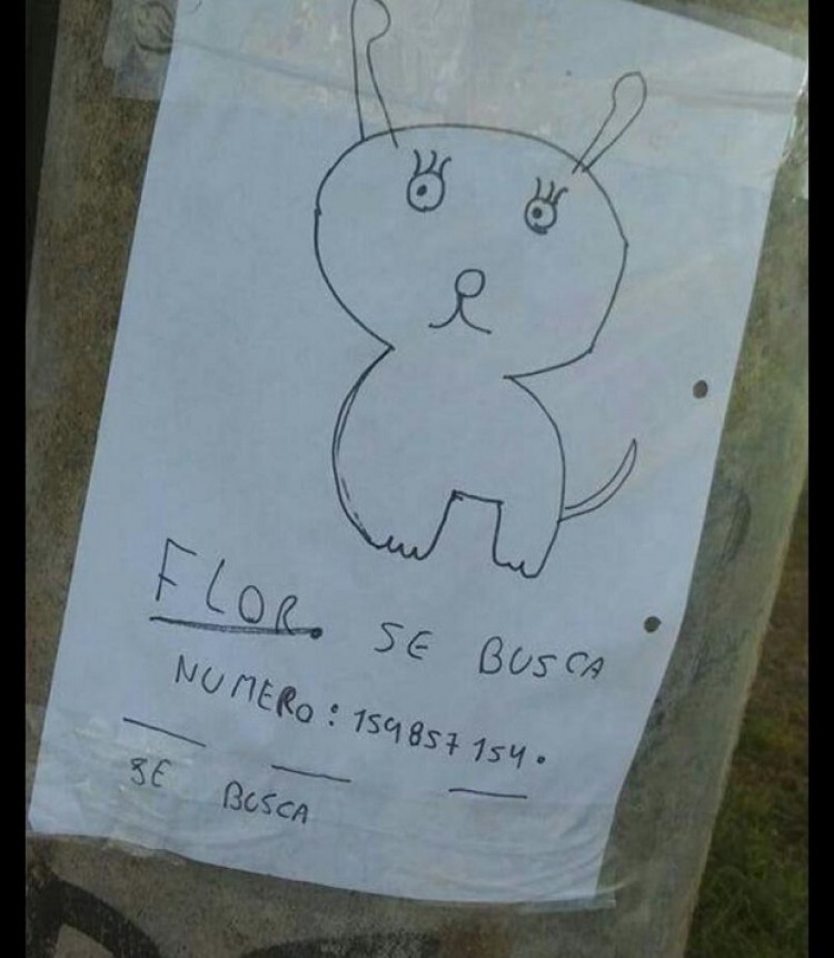 Lisandro y Valentino son dos niños de Río Cuarto (Córdoba) que en las últimas horas se dieron con la peor noticia que puede recibir quien tiene y ama una mascota: su perrita se perdió.Lo insólito y más tierno tiene que ver con la idea que tuvieron para intentar recuperarla. Como no tienen ninguna foto para que la gente la identifique, decidieron dibujarla. Y salieron a empapelar las calles del barrio.Y el resultado fue el hermoso dibujo de una simpática perrita, en una hoja en blanco y con la leyenda “Flor. Se busca”. Lo acompañaron con un número de teléfono para dar aviso, en caso de que alguien la encuentre. El celular es de una vecina del Barrio Fénix de esa ciudad. Sucede que en la casa de los niños no hay cámaras que guarden una foto de la mascota ni celular para dejar de contacto.La perrita se habría perdido entre las calles Adelia María y Almirante Brown, y a pesar de que los pequeños la dibujaron sólo con un trazo negro, trascendió que es de color marrón claro. La conmovedora y tierna historia es de las más compartidas por los riocuartenses en las redes sociales.Fuente: Telediario Digital de Río Cuarto