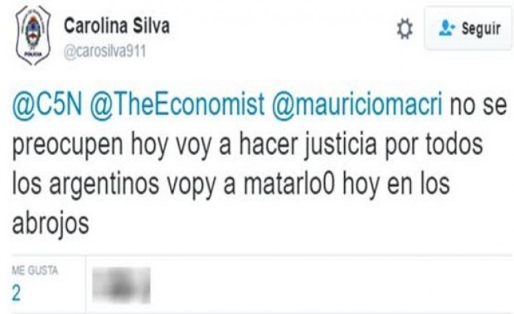 En su declaración testimonial, la mujer policía declaró que su expareja le hackeó la cuenta, en que también aparecen amenazas contra la gobernadora de la Provincia de Buenos Aires, María Eugenia Vidal, entre otras figuras de Cambiemos.Clara Carolina Silva, de 41 años de edad, tuvo que ver cómo efectivos de su propia fuerza llegaban a su casa en la localidad bonaerense de José C. Paz para detenerla por amenazar de muerte al Presidente de la Nación.Desde @carosilva911, una cuenta de Twitter que usa su nombre, la cuenta oficial de Mauricio Macri recibió una advertencia explícita el sábado al mediodía: "Hoy te voy a matar acá en la quinta Los Abrojos. Ojalá estés con tus hijos así mueren todos juntos".La ministra de Seguridad, Patricia Bullrich, fue mencionada en Twitter por la cuenta de Silva con el mismo tono amenazante.Tras esos tuits, se produjo una denuncia anónima al 911, que recayó en la UFI N°22 de Malvinas Argentinas y en el Juzgado Federal N°2 de Lomas de Zamora.Los tuits llevaban no solo su nombre y apellido, sino también su número de legajo y su DNI, lo que hace presumir que probablemente Silva no estaba usando su cuenta porque al poner su información personal desearía identificarse para que la detuvieran.Según el portal Infobae, ante el juez de la causa, la sargenta negó que la cuenta fuese suya e incluso señaló como posible responsable a su expareja, también efectivo de la Bonaerense, un oficial subinspector del cual se separó hace más de un año.Silva aseguró que no es la primera vez que su ex la involucra en hechos falsos.En la lista de tuits, hay mensajes que señalan a Vidal con un fuerte enojo y que tienen una evidente lectura de cara a las nuevas internas de la Bonaerense, con 20 comisarios mayores que tuvieron que abandonar sus puestos con la nueva gestión de Cambiemos.Esto se suma a la quita del control de horas adicionales en espectáculos deportivos y las siete plantas verificadoras de automóviles que controla la fuerza a lo largo de la provincia, dos cajas clave para la Policía provincial, y a las acusaciones que enfrenta el jefe Pablo Bressi por presunta complicidad narco, recaudación negra y violencia de género."Hija de puta, tenés que morirte, no me vas a poder echar. Junto la plata para vos también", fue uno de varios tuits dedicado a la gobernadora. "La plata que yo junto del juego se la llevan ustedes, así que no sé qué descubrió", continuó."No es tan inalcalzable Mauricio, hoy se los voy a demostrar. La Policía no amenaza, cumple y mata", dice uno de los tuits, tras lo cual lanzó en otro, en que también está arrobada la cuenta del Presidente: "No se preocupen hoy voy a hacer justicia por todos los argentinos. Voy a matarlo hoy en Los Abrojos".En otro tuit lanzado a Bullrich, le pidió a la mininistra que "hoy cuide al presi" porque "hoy lo voy a cagar a tiros en la quinta Los Abrojos"."Soy policía, no te olvides", advirtió y señaló: "Bullrich, dejate de joder, soy Silva Clara Carolina, policía, cuiudate. Tengo muchas balas para vos, te podés tropezar con una".También amenzó a la líder de la Coalición Cívica-ARI, Elisa Carrió, al decirle: "Cuidate mucho, podés tener un accidente muy grave".Fuente: Noticias Argentinas