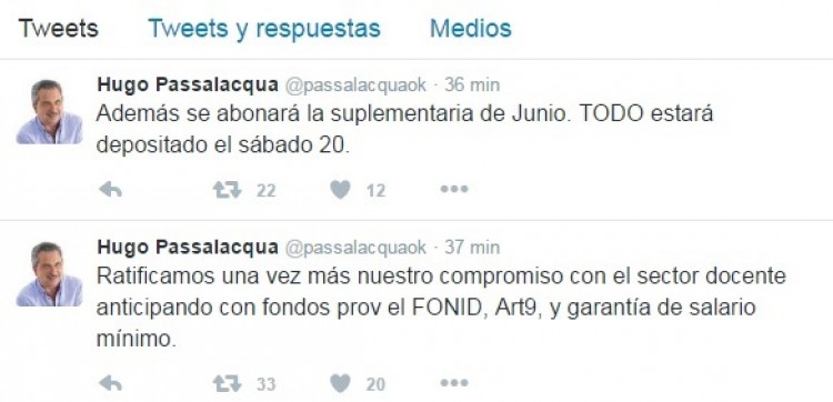A través de su cuenta de Twitter, el gobernador Hugo Passalacqua anunció que el sábado 20 de agosto estarán depositados los fondos para el pago del Fonid, el Artículo 9, la garantía de salario mínimo y la suplementaria del mes de junio, para el sector docente. De este modo, la Provincia anticipa con recursos propios los fondos nacionales, excepto el pago de suplementaria que es de carácter provincial.“Ratificamos una vez más nuestro compromiso con el sector docente, anticipando con fondos provinciales el Fonid, el Artículo 9 y la garantía de salario mínimo. Además, se abonará la suplementaria del mes de junio. Todo estará depositado el sábado 20”, remarcó el mandatario.