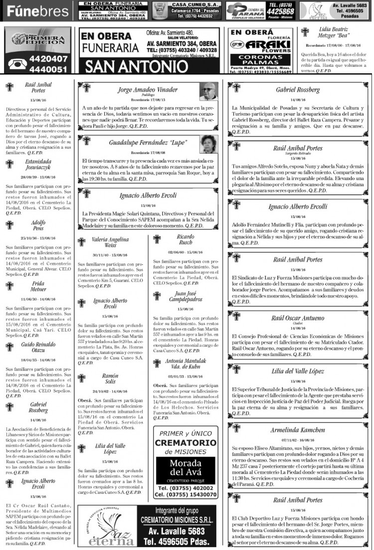 Fúnebres del miércoles 17 de agosto de 2016