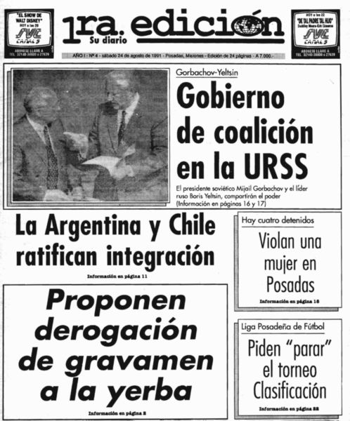 La crisis soviética sigue acaparando las portadas de todos los medios del mundo, aunque en Misiones también ganan terreno conflictos locales como el eterno de la yerba mate.En esa misma línea, resulta significativo el paralelismo entre hoy y hace 25 años en torno al agitado "matrimonio" entre el fútbol y la TV.Y dos "perlitas" de esa cuarta edición del diario: la historia de vida en contratapa firmada por el mítico José María Arrúa y la página que en esa época se dedicaba a la actualidad de Encarnación, con corresponsalía propia en esa ciudad paraguaya.