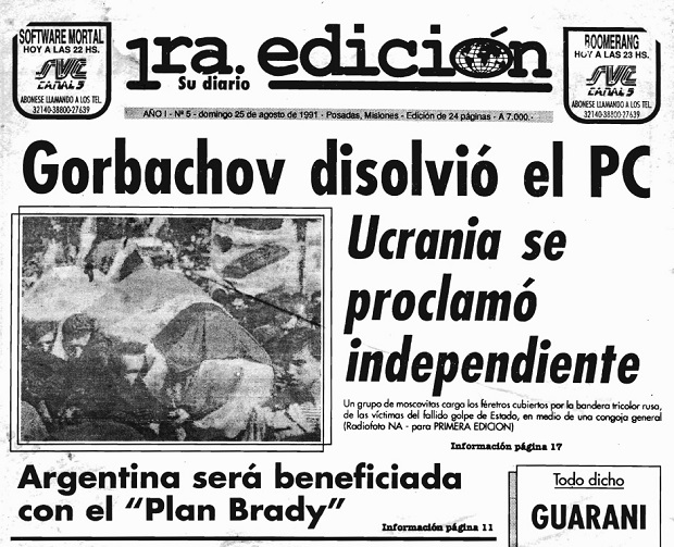 Ese día, además de las resonantes novedades surgidas de la Unión Soviética durante la jornada previa, como la disolución del Partido Comunista y la declaración de independencia de Ucrania, está marcado por la aparición de la primera columna dominical de análisis político, en esa época firmada por el recordado José María Arrúa. Además, notas "color" como el florecimiento de los lapachos (a cargo de Olga Kolesnicoff, lamentablemente fallecida poco más tarde en el cumplimiento de sus tareas periodísticas) y, dentro de una amplia sección deportiva como corresponde a la actividad del fin de semana, el anticipo de uno de los grandes clásicos futbolísticos en Posadas, entre Mitre y Guaraní.
